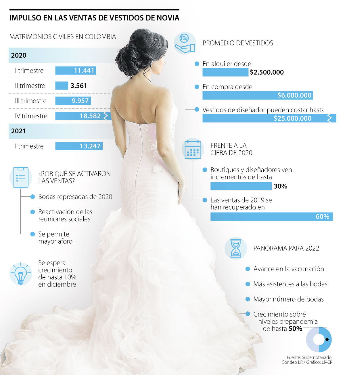 Este año, tal como destaca Peláez, las bodas empezaron a reactivarse gracias a menos restricciones de aforo y movilidad. Por ejemplo, al revisar los matrimonios civiles en la Superintendencia de Notariado y Registro, el año pasado hubo 19.472 celebraciones, y para 2021, a corte de marzo, la cifra llegó a 5.949, cantidad por encima de lo alcanzado el primer trimestre de 2020, cuando aún no era fuerte el impacto de la pandemia.