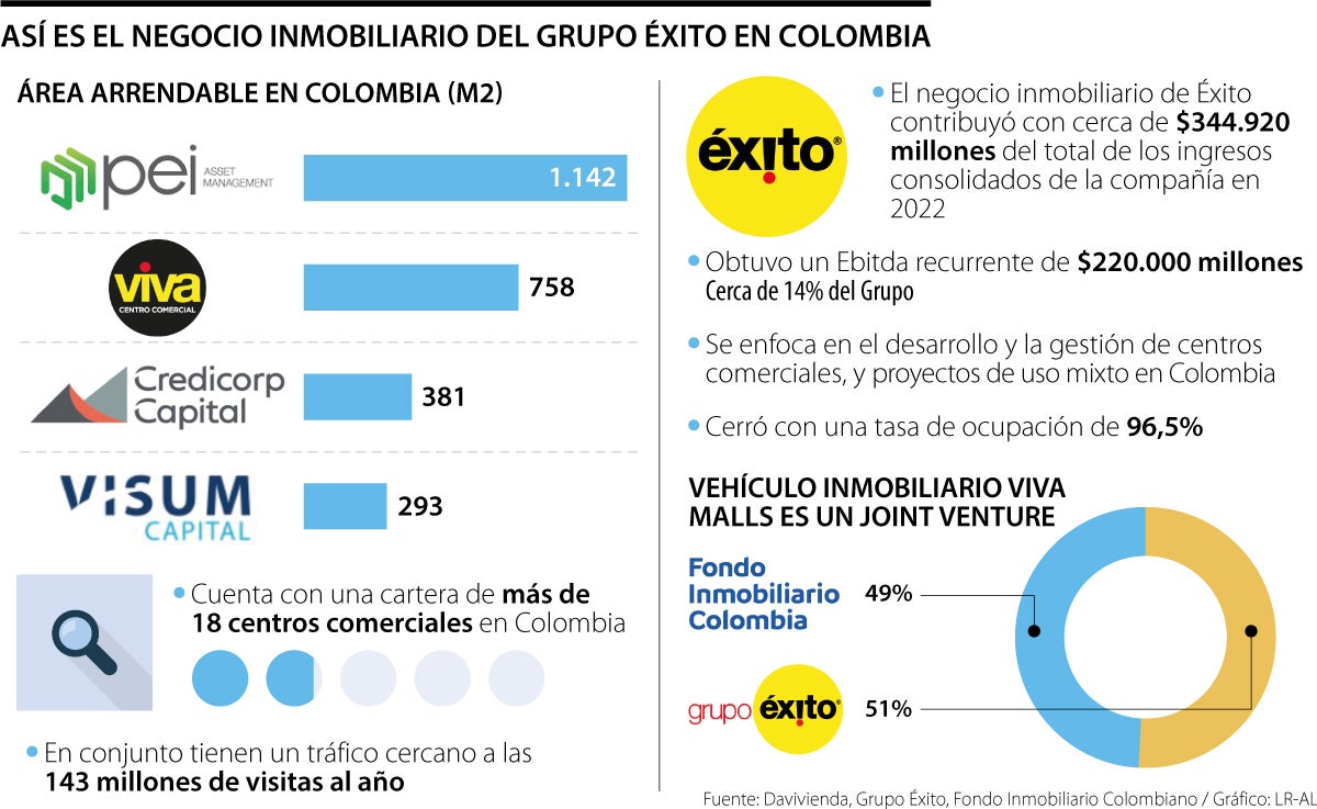 Más allá del retail, el Éxito es un grupo con un músculo inmobiliario que, en Colombia, solo está por debajo del PEI Asset Management y que tiene un área arrendable de 758.000 metros cuadrados, incluyendo unos centros comerciales que reciben 143 millones de visitas al año y que explotan la marca Viva. El negocio ahora entra en la órbita de los analistas, después de la oferta de Jaime Gilinski que fue rechazada esta semana y que podría ser el capítulo inicial de una batalla por la compañía paisa.
