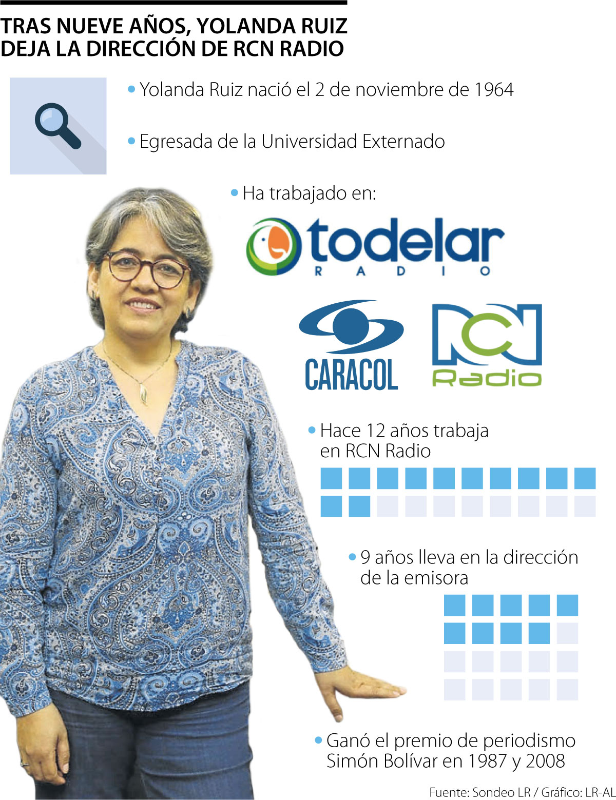 Tras 12 años de estar en RCN Radio, medio que forma parte de la Organización Ardila Lülle (OAL), de los cuales nueve estuvo al frente de la dirección de noticias de la emisora, Yolanda Ruiz anunció su retiro. La periodista pastusa, ganadora de dos premios de periodismo Simón Bolívar anunció que ayer, lunes, fue su último día al aire en los micrófonos de la cadena.