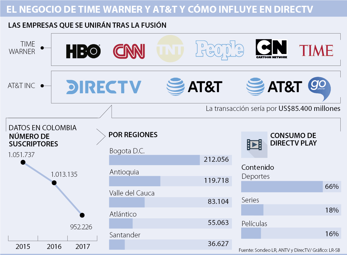 En lo que se refiere al mercado local de televisión paga, AT&T tiene presencia en Colombia con DirecTV, compañía que adquirió en 2015 y cuya operación en América Latina depende de Vrio Corp, una holding creada para consolidar las operaciones de 11 países de la región que hoy reúne 13,6 millones de suscriptores. Mientras tanto, Time Warner apareció en el país a través del grupo Turner International, responsable de canales como Cartoon Network, TNT y HBO.