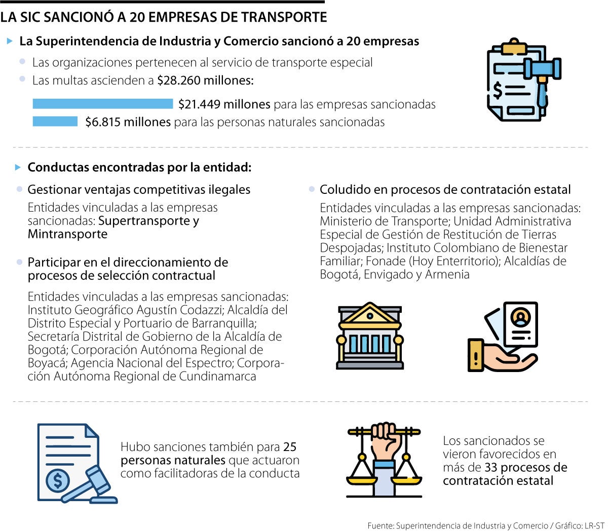 La Superintendencia de Industria y Comercio emitió una sanción a 20 empresas y 26 personas naturales que se habrían beneficiado de ventajas competitivas ilegales en 33 procesos de contratación estatal ocurridos entre 2014 y 2020. La Superindustria reconoció que las prácticas en las que los implicados incurrieron se catalogan como colusión; las multas ascienden a cerca de $28.600 millones.