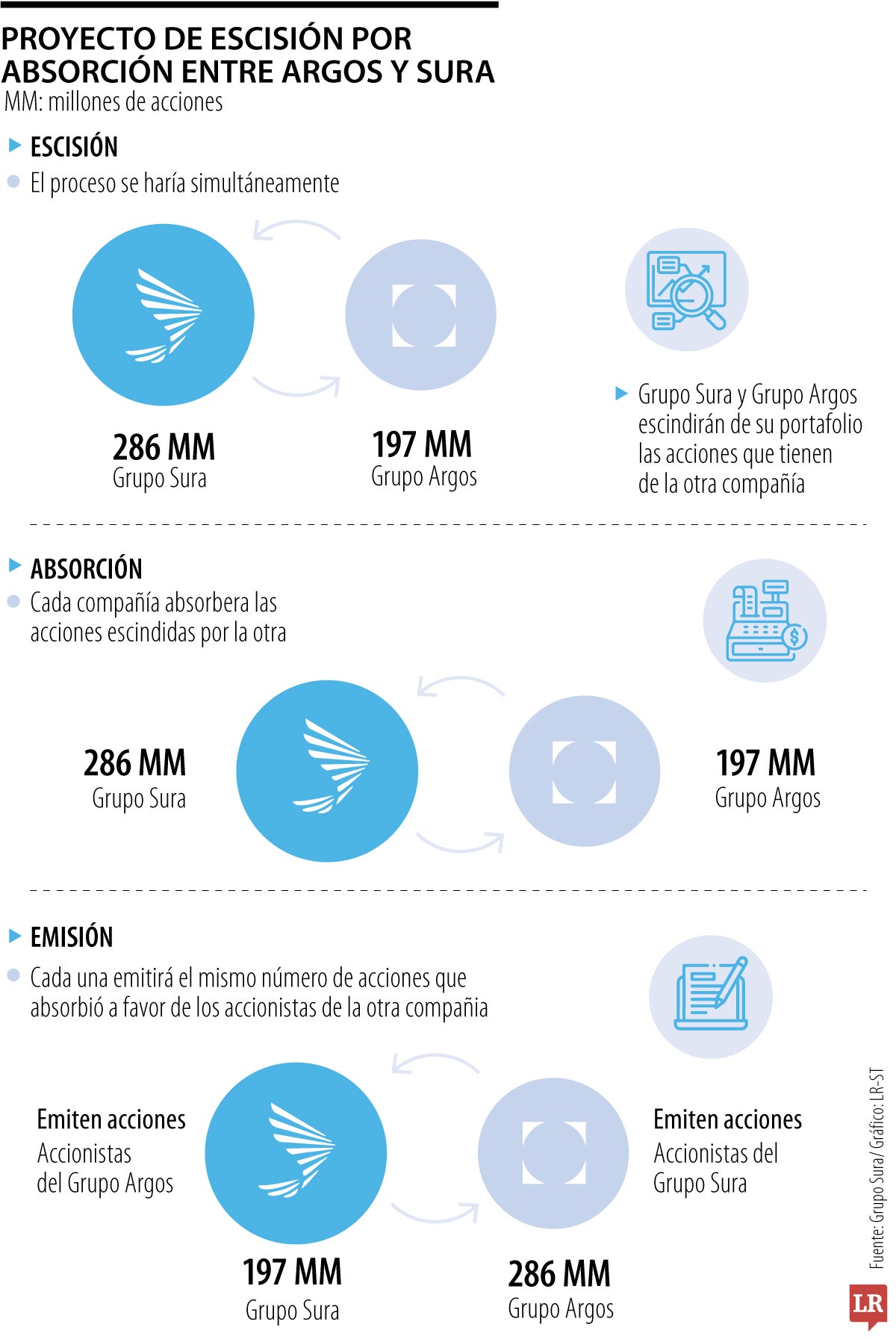 En términos concretos, cuando se termine la operación, un accionista de Grupo Argos conservará su misma acción, pero además recibirá 0,23 acciones de Grupo Sura. A su vez, los que tengan un título de Grupo Sura, también obtendrán 0,72 acciones del Grupo Argos.