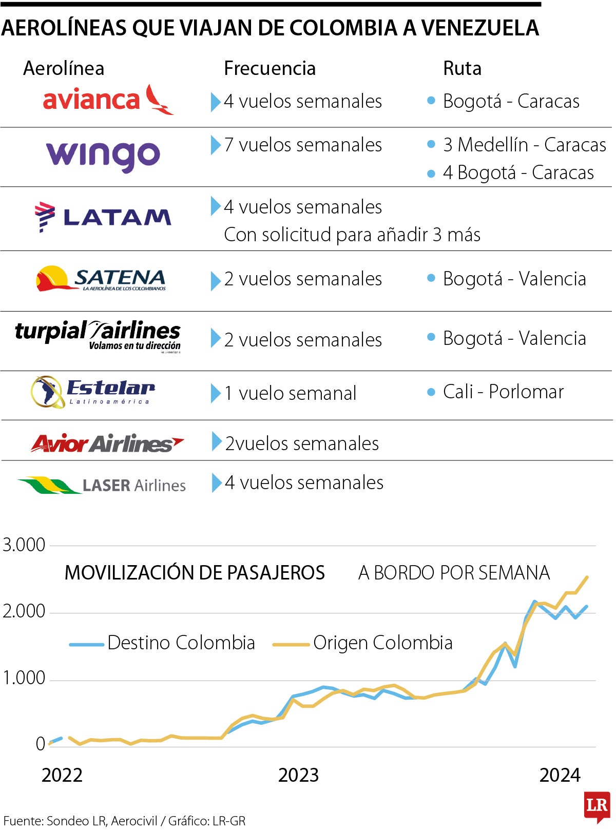 Son ocho las aerolíneas que operan vuelos a Venezuela, sumando más de 25 frecuencia: Wingo, en primer lugar con siete frecuencias; Avianca, con cuatro vuelos semanales; al igual que Latam y Laser; Satena, Avior y Turpial Airlines con dos cada una y Estelar Latinoamérica con uno en la semana. La mayoría de los vuelos son desde Bogotá a Caracas pero algunos con destino a Valencia y Maracaibo y salida desde Medellín y Cali (Ver gráfico).