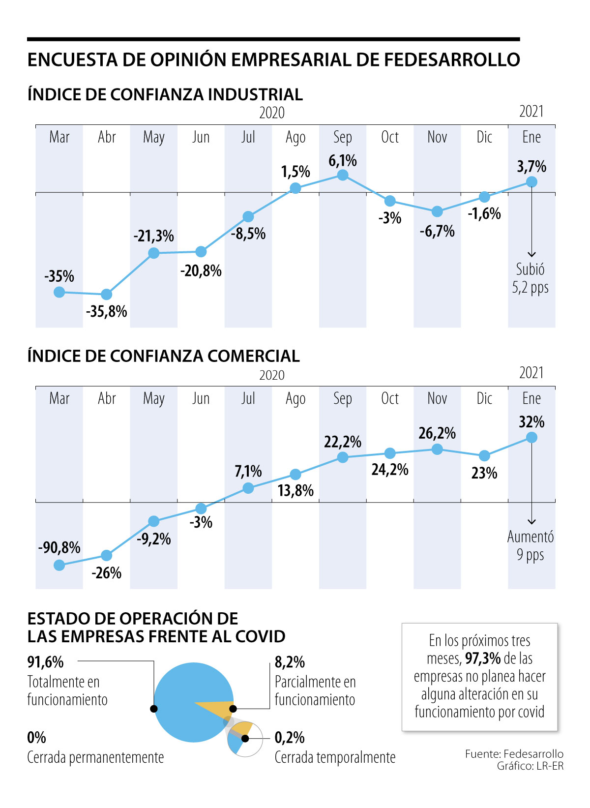 Fedesarrollo presentó su Encuesta de Opinión Empresarial para enero de 2020 y en el informe se destaca que el Índice de Confianza Comercial se ubicó en 32%, lo que representó un incremento de nueve puntos porcentuales (pps) frente al mes anterior y completa siete meses consecutivos al alza, mientras que el Índice de Confianza Industrial se ubicó en 3,7%, un alza de 5,2 pps. Una dinámica impulsada por la vacunación y las expectativas.
