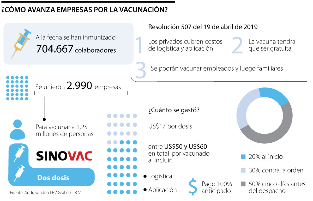 A la fecha se han inmunizado más de 704.000 personas por medio de ‘Empresas por la vacunación’, programa en el que se han incluido colaboradores y algunos familiares. La meta es que se totalicen 1,25 millones de personas.