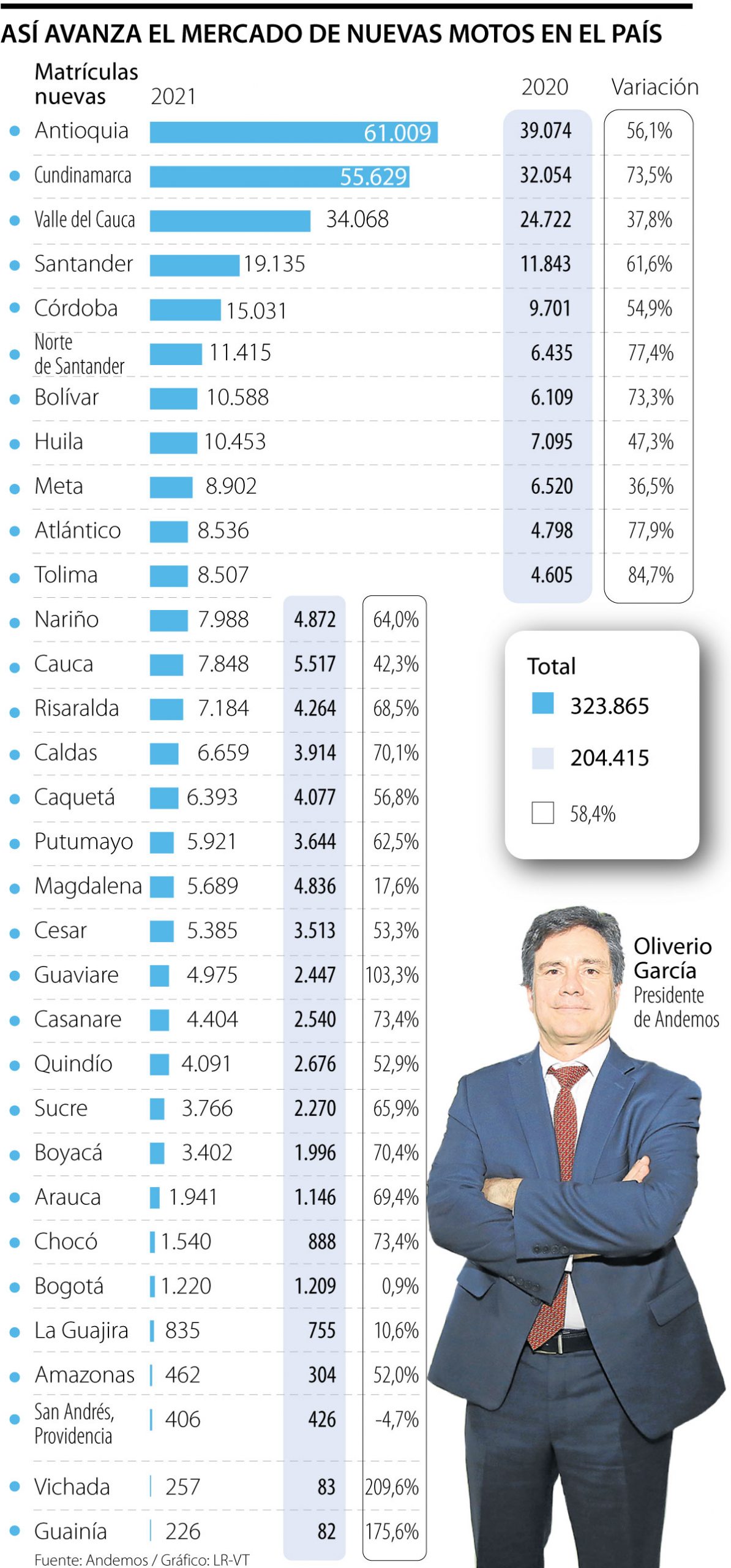 Con todo y los bloqueos estamos hablando de que para 2021 se van a vender en Colombia entre 675.000 y 690.000 motos. Los bloqueos le dieron un golpe al mercado y afectaron el suministro de piezas para ensamble y mantenimiento. La fabricación de motos fue afectada claramente. No nos olvidemos que este es un mercado de motos japonesas, en su mayoría, y entran por Buenaventura. Si no se presentan más bloqueos ni problemas, la proyección es muy buena.