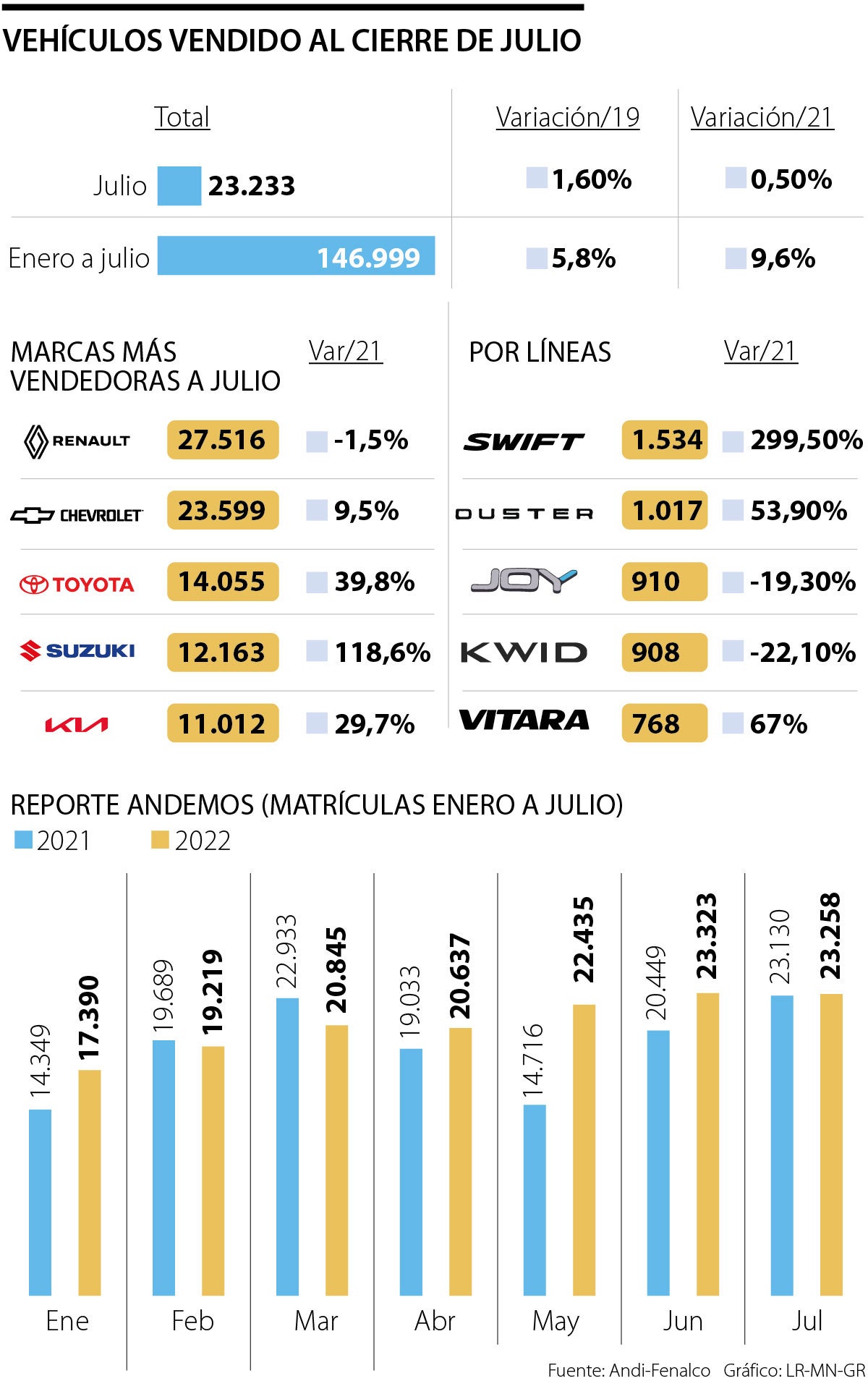 Otro de los gremios que analiza el sector es Andemos. Según su más reciente informe, en julio se registraron 23.258 matrículas nuevas, esto significó un aumento de 14,1%. Mientras que, durante el primer semestre de 2022, el sector automotor comercializó un total de 147.107 vehículos, 9,5% más que 2021. Aquí la marca más vendedor fue Renault, con 27.533 vehículos a cierre de julio.
