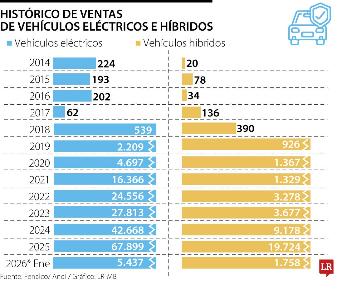 Fenalco y la Andi lanzaron el informe de matrícula de vehículos híbridos y eléctricos para enero. Durante el primer mes del año, las ventas de unidades eléctricas crecieron 82,6%, con 1.758 unidades vendidas respecto al mismo mes de 2025. Las ventas representan 8,8% sobre el total de vehículos vendidos durante enero.