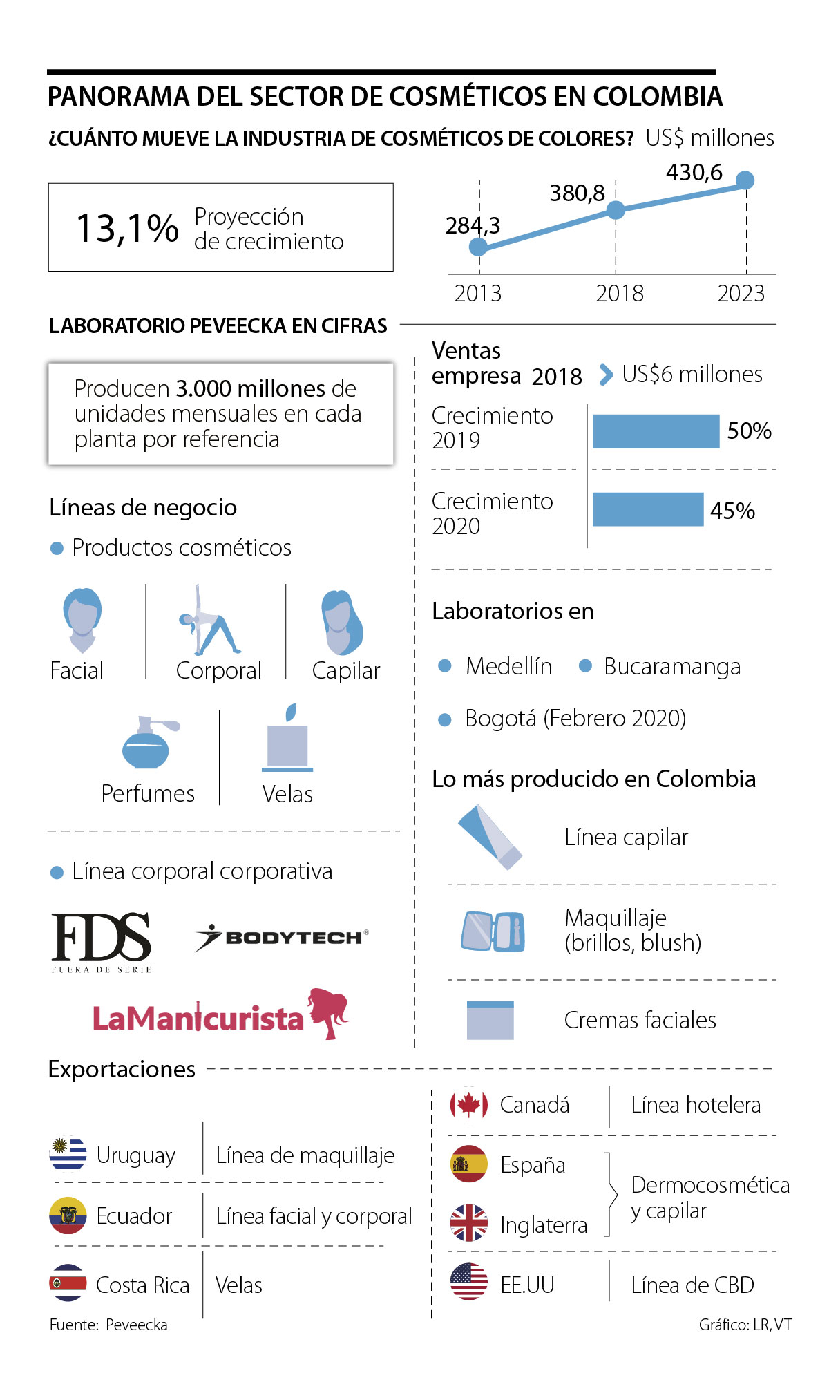 Las cifras del mercado de producción de cosméticos engloban diferentes líneas de producto como corporales, faciales, capilares y de colores, estos últimos incluyen el maquillaje, y según cifras de Euromonitor, esa industria movió alrededor de US$380 millones en 2018, y su proyección de crecimiento para el 2023 es de más del 13%.