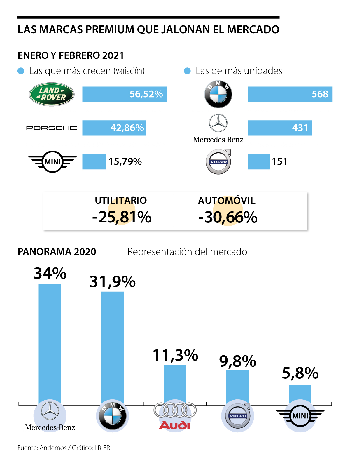 En la carrera por conquistar el mercado automotor, las marcas premium avanzan en medio de la recuperación. En lo corrido del año, según registró Andemos, se matricularon 1.447 unidades, lo que representó una caída de 25,8% frente a lo alcanzado durante los dos primeros meses de 2020.