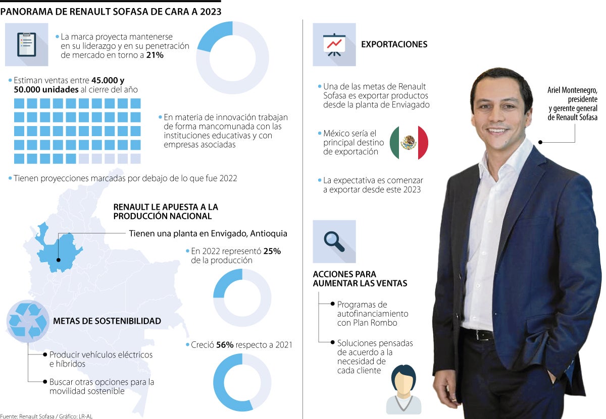 Con más de 52 años en la industria, Renault Sofasa ha logrado obtener 25% del mercado colombiano. Aunque no están en el podio de los más vendidos y las proyecciones están marcadas por debajo de los resultados de 2022, donde aumentaron 56% la producción, la marca apuesta por retomar el liderazgo con cuatro lanzamientos de vehículos 100% eléctricos y ventas entre 45.000 y 50.000 unidades al cierre del año, explica Ariel Montenegro, presidente y gerente general de la compañía.