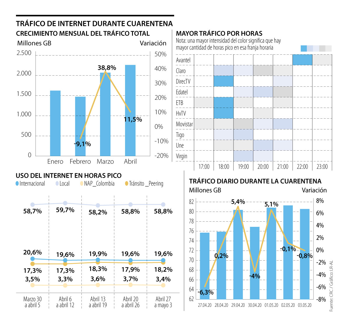 Según cifras del quinto reporte de la Comisión de Regulación de Comunicaciones (CRC), el tráfico mensual de abril aumento 11,5% con respecto a marzo por el lado del servicio fijo. Sin embargo, en el internet móvil se ha visto una reducción de 1,82% desde la primera semana de marzo hasta fecha, según Fabián Hernández, presidente CEO de Movistar.