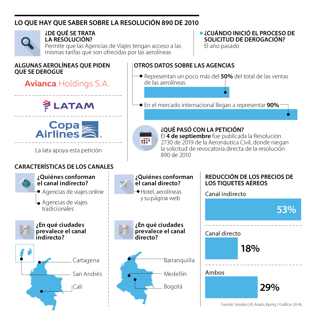 Con base en la petición anterior, LR consultó a las aerolíneas sobre cuáles son los beneficios que traería consigo la derogación de dicha resolución. Según Juan Manuel Pérez, director de estrategia comercial de Avianca Holdings, “derogando la resolución 890, los costos asociados con los tiquetes podrían disminuir sustancialmente en relación al canal de venta que se utilice, ya que cada canal tiene costos diferentes”.