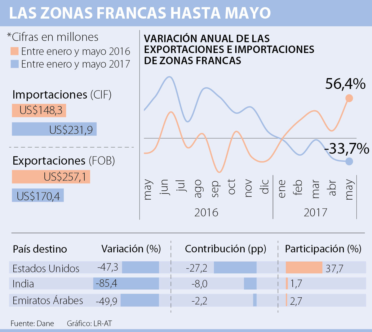 El Dane reportó que las exportaciones hechas desde las zonas francas entre enero y mayo cayeron 33,7%. Entre las razones sobresalió la disminución de las ventas externas a Estados Unidos e India.