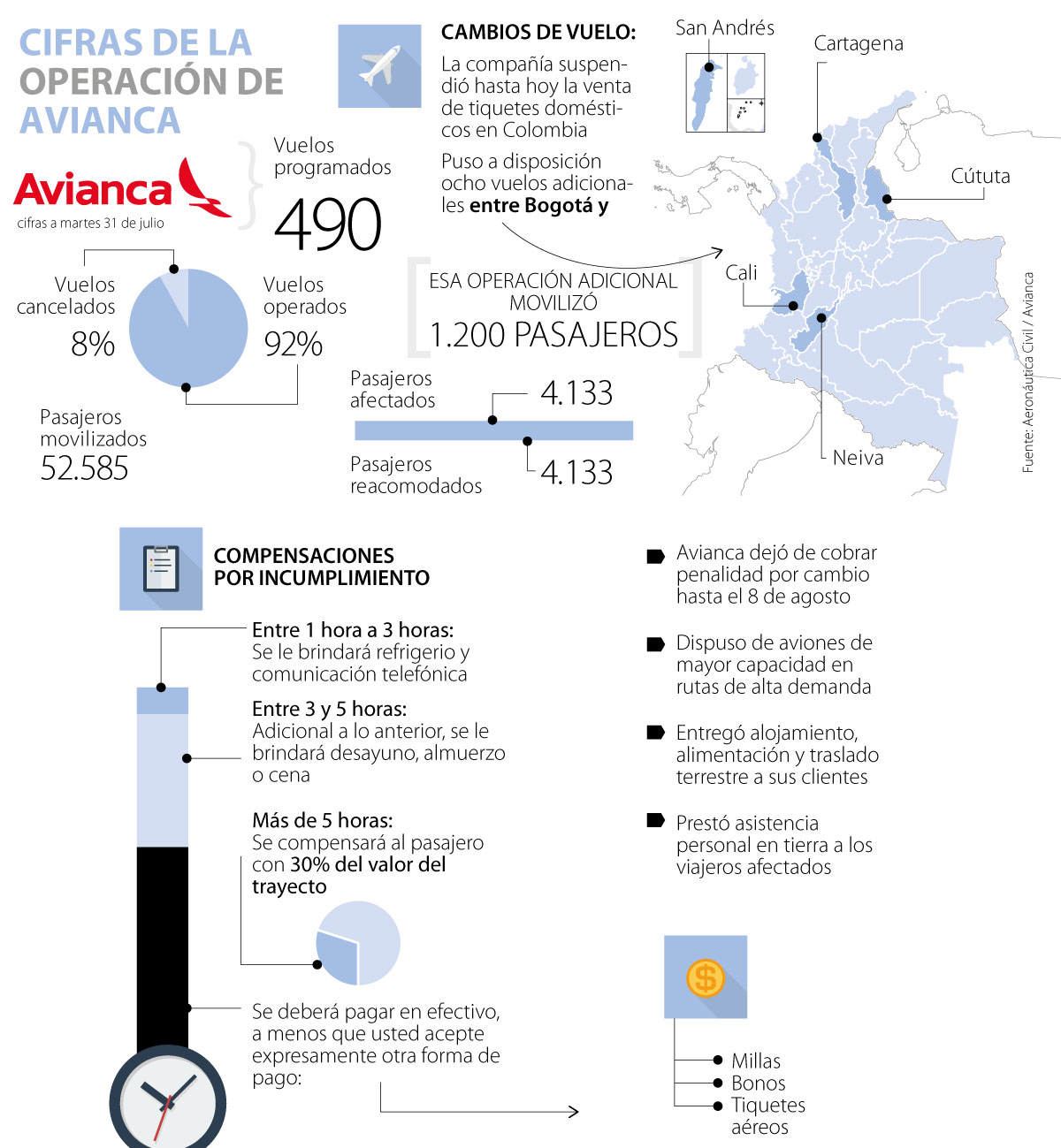 Como consecuencia, el miércoles primero de agosto los equipos aéreos no se presentaron y 8% de los vuelos programados por la aerolínea (490 en total) fueron cancelados. La contingencia dejó a 4.133 pasajeros afectados, que posteriormente fueron reacomodados en su totalidad. Ayer, la compañía canceló nuevamente 15 vuelos adicionales (3% de la operación) de manera preventiva y suspendió la venta de tiquetes domésticos en Colombia hasta hoy.