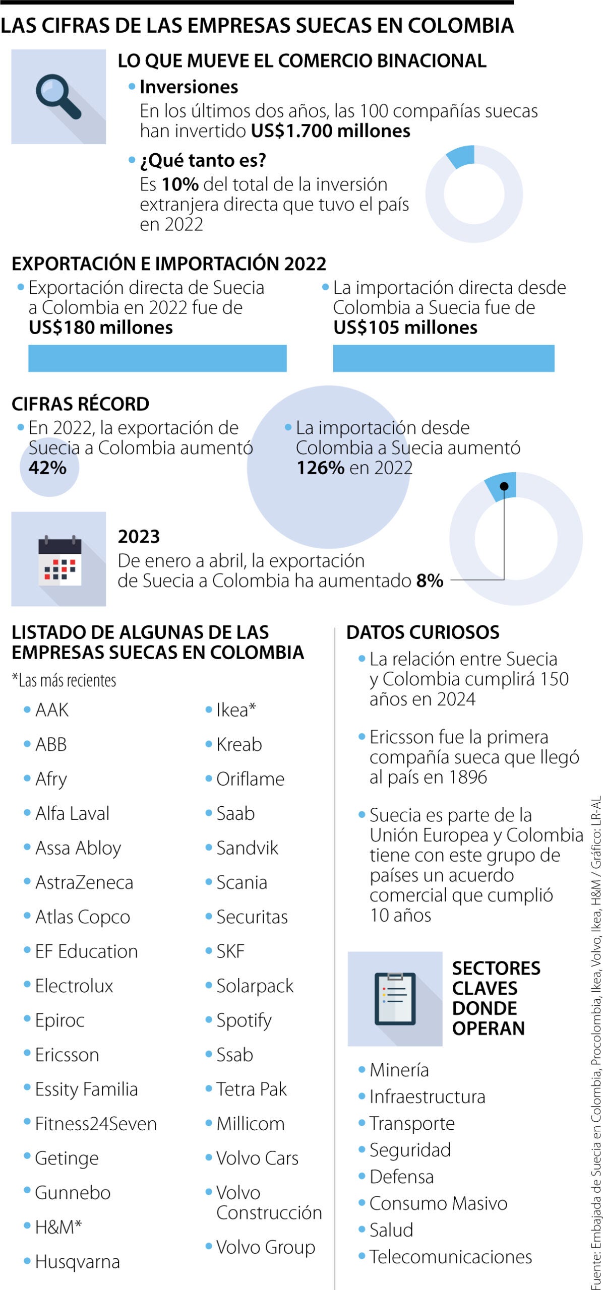 En el listado de las empresas suecas en Colombia están, además de Ericsson, AAK, Ikea, Electrolux y H&M, otras grandes como la de equipos de minería y construcción Epiroc; la de higiene y salud Essity Familia; la fabricante de motocicletas Husqvarna; la automotriz de camiones y buses, Scania; la proveedora de servicios de seguridad, Securitas; el operador móvil, Millicom, cuyo socio mayoritario es sueco; la empresa de soluciones de envasado y procesamiento de alimentos, Tetra Pak; y Volvo Cars, Volvo Construcción y Volvo Group, por nombrar algunas (ver gráfico).