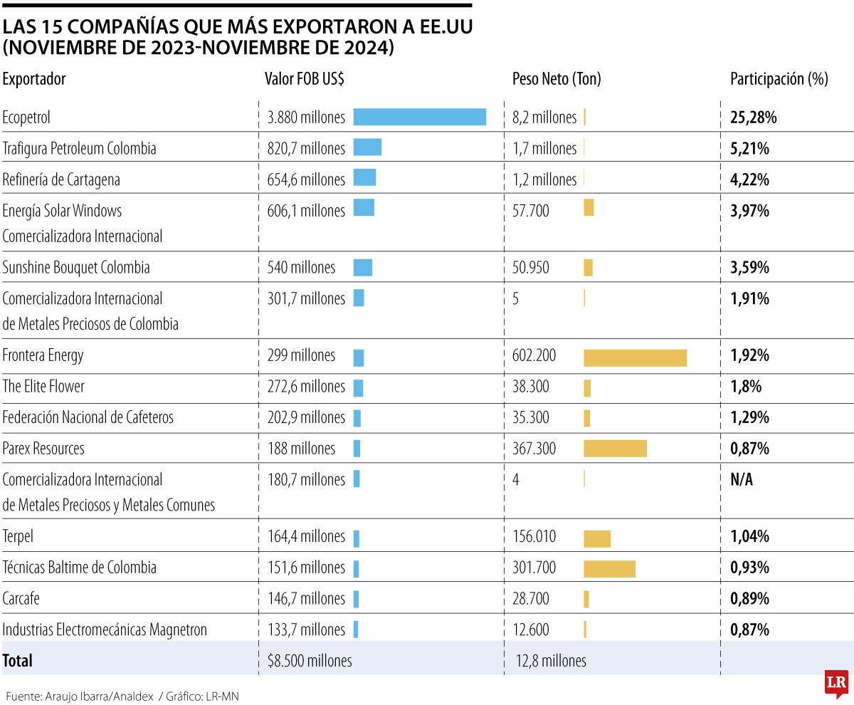 Tanto Araujo Ibarra como la Asociación Nacional de Comercio Exterior, Analdex, revelaron que las empresas que más exportan a EE.UU son Ecopetrol, Trafigura Petroleum Colombia, la Refinería de Cartagena, la comercializadora internacional Energía Solar y Sunshine Bouquet.