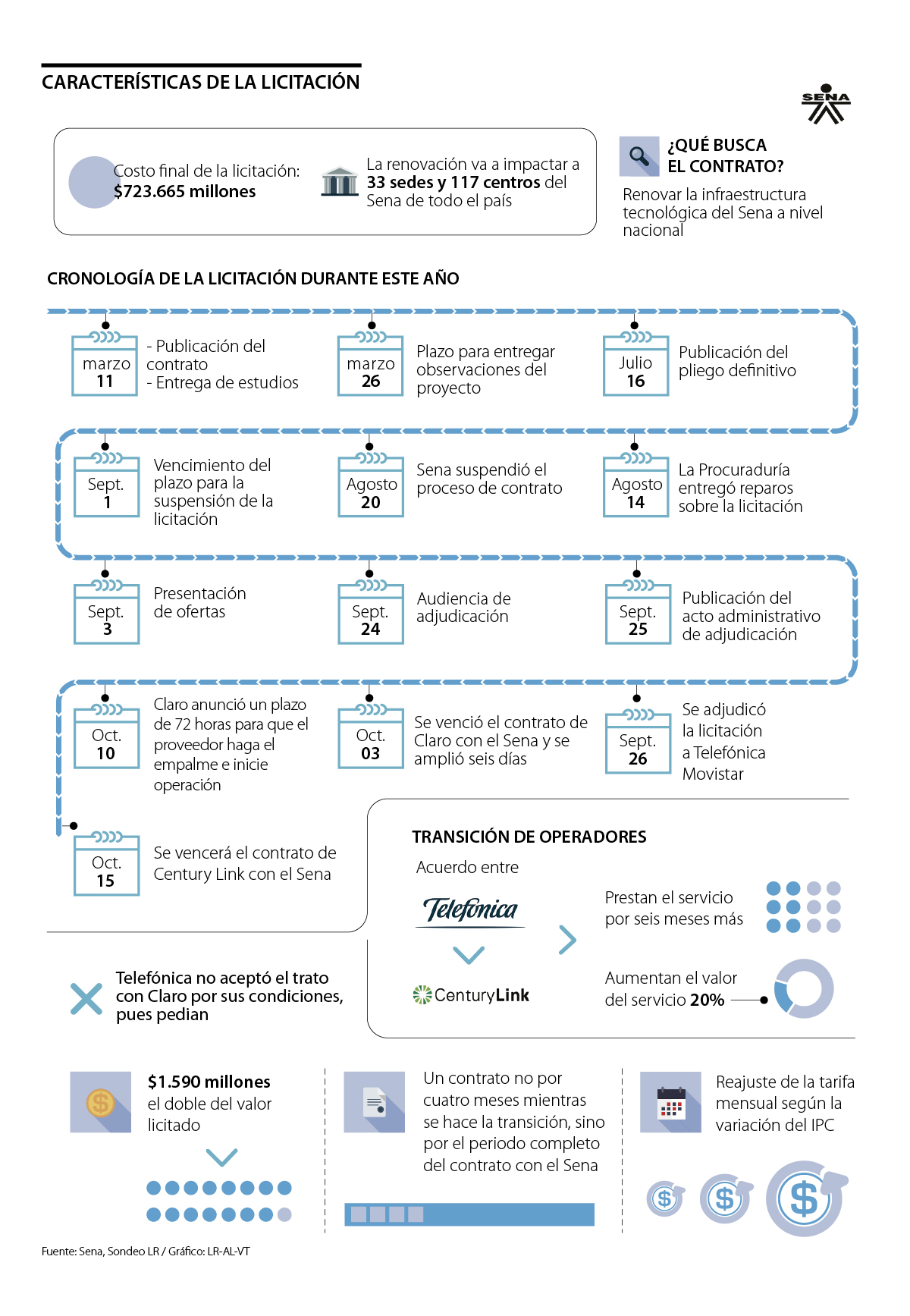 Además, explicaron que “Telefónica pidió una oferta y Claro envió un valor con descuento de 65% del precio de lista registrado en los contratos marco de Colombia Compra Eficiente, el cual está incluso por debajo de los precios de mercado”, y agregaron que “a la fecha, Claro, en muestra a su buena voluntad, sigue prestando los servicios casi en 100% para no afectar los estudiantes, pero sin certeza de quién va a pagar dichos servicios, porque su contrato con el Sena se encuentra vencido”.