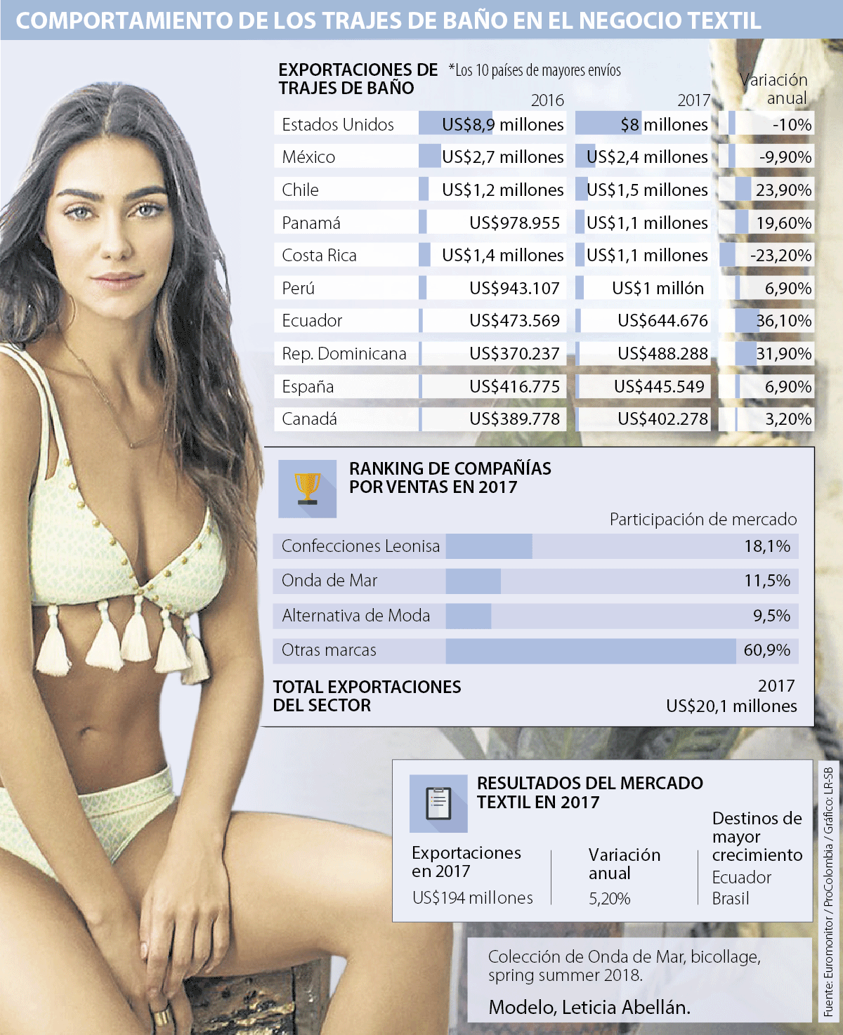 Estudios de Euromonitor apuntan a que 40% de la participación del mercado se concentra en Leonisa, Onda de Mar y Alternativa de Moda, y el restante se refleja en emprendimientos o diseñadores independientes dedicados a vender fuera de Colombia.