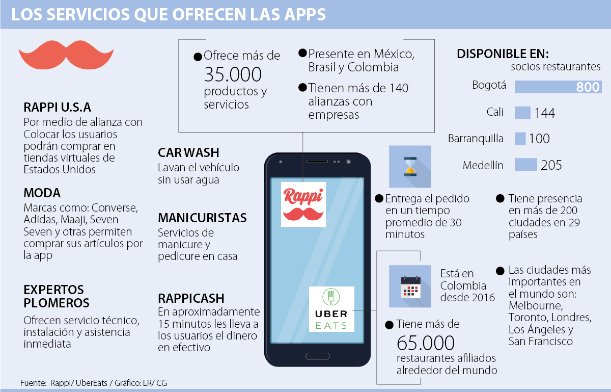 Los servicios son diferenciales y no son fáciles de comparar, por ejemplo UberEats, que es una aplicación creada en San Francisco, recientemente amplió su cobertura en el país llegando a ciudades como Medellín, Cali y Barranquilla en las que según Riera lograron tener en el primer día alianzas con más de 400 locales; 200 en Medellín, más de 150 en Cali y más de 100 restaurantes en Barranquilla.