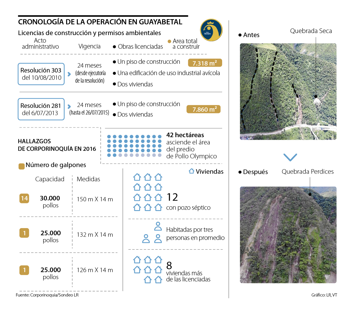 El problema se agudizó tres años después, cuando Corporinoquia realizó una visita técnica a las instalaciones de Pollo Olympico en Guayabetal, a mediados de diciembre. Allí, encontraron que los 16 galpones ubicados en la zona (ver gráfico) no contaban con sistema de recolección de aguas de escorrentía en los techos.