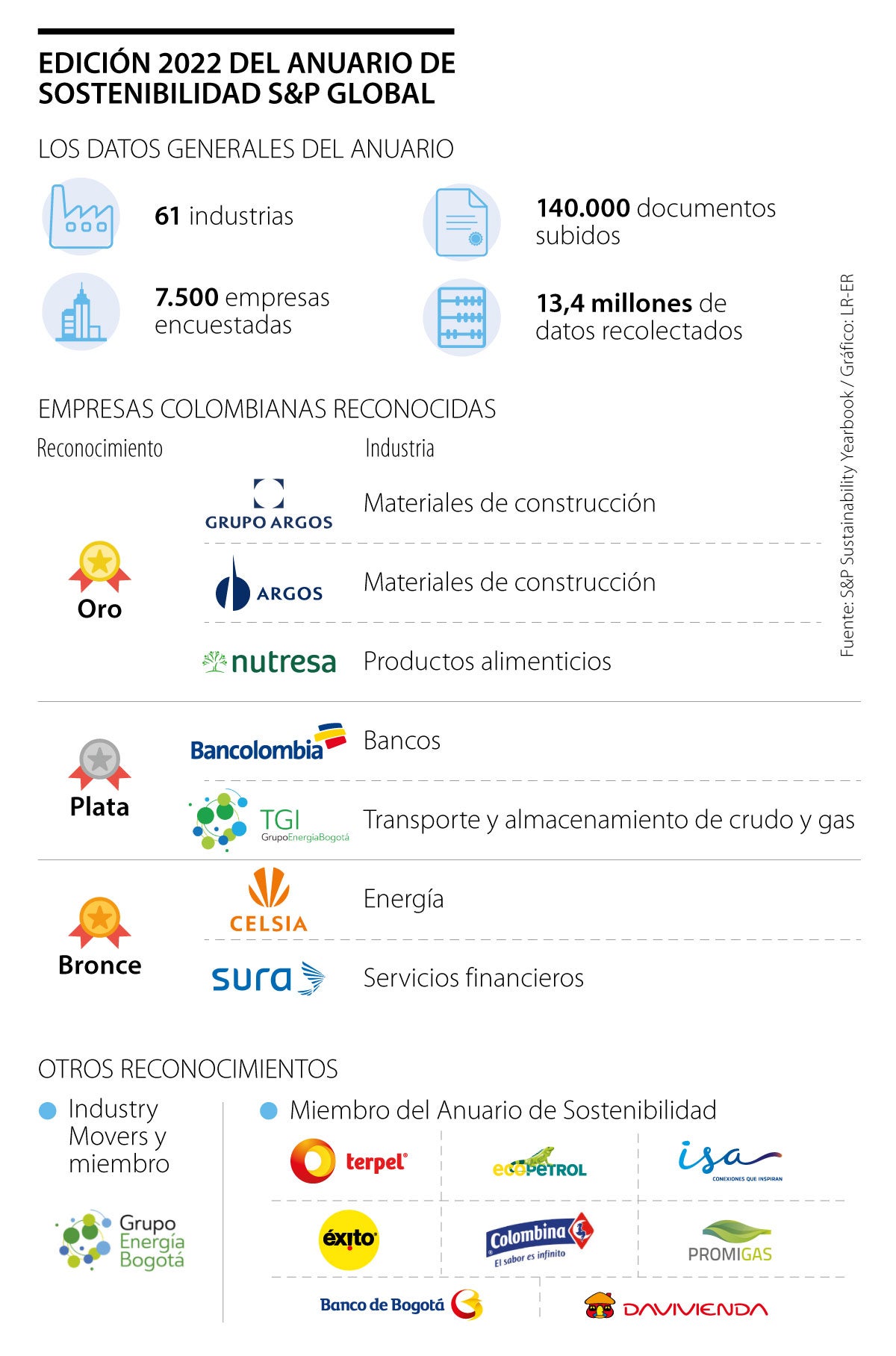 Aparte de las tres categorías principales (oro, plata y bronce), el Anuario de Sostenibilidad también destaca a las empresas dentro del 15% superior de cada industria como ‘Industry movers’ o como Miembros, si han sido incluidas en el Anuario, pero que no han recibido una distinción de medalla. Como ‘Industry Mover’ fue destacada Grupo Energía Bogotá, que fue la única colombiana con este reconocimiento. Por su parte, Banco de Bogotá, Banco Davivienda, Interconexión Eléctrica, Almacenes Éxito, Colombina, Promigas, Ecopetrol y Terpel fueron parte de los miembros de la selección.