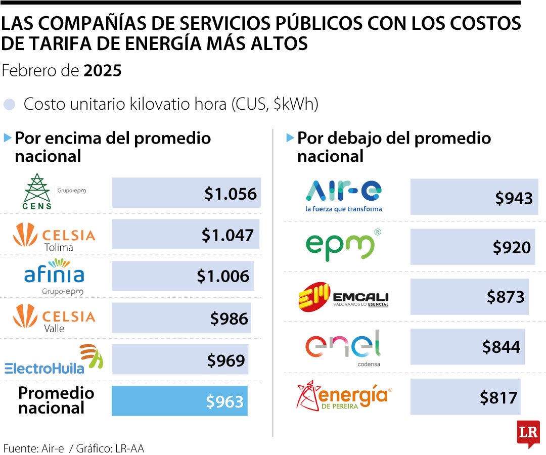Con base en cifras de Air-e, la empresa de energía eléctrica que opera en el Caribe, en febrero de 2025 hubo compañías del sector que superaron el promedio nacional en el costo unitario del kilovatio hora. En primer lugar, está Centrales Eléctricas de Norte de Santander con una cifra de $1.056, luego está Celsia Tolima ($1.047), Afinia ($1.006), Celsia Valle ($986) y Electrohuila ($969).