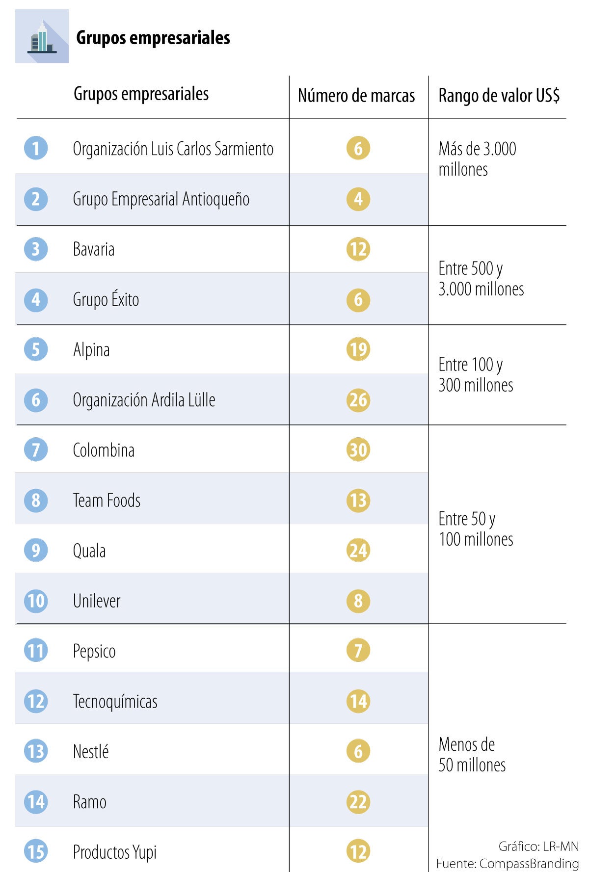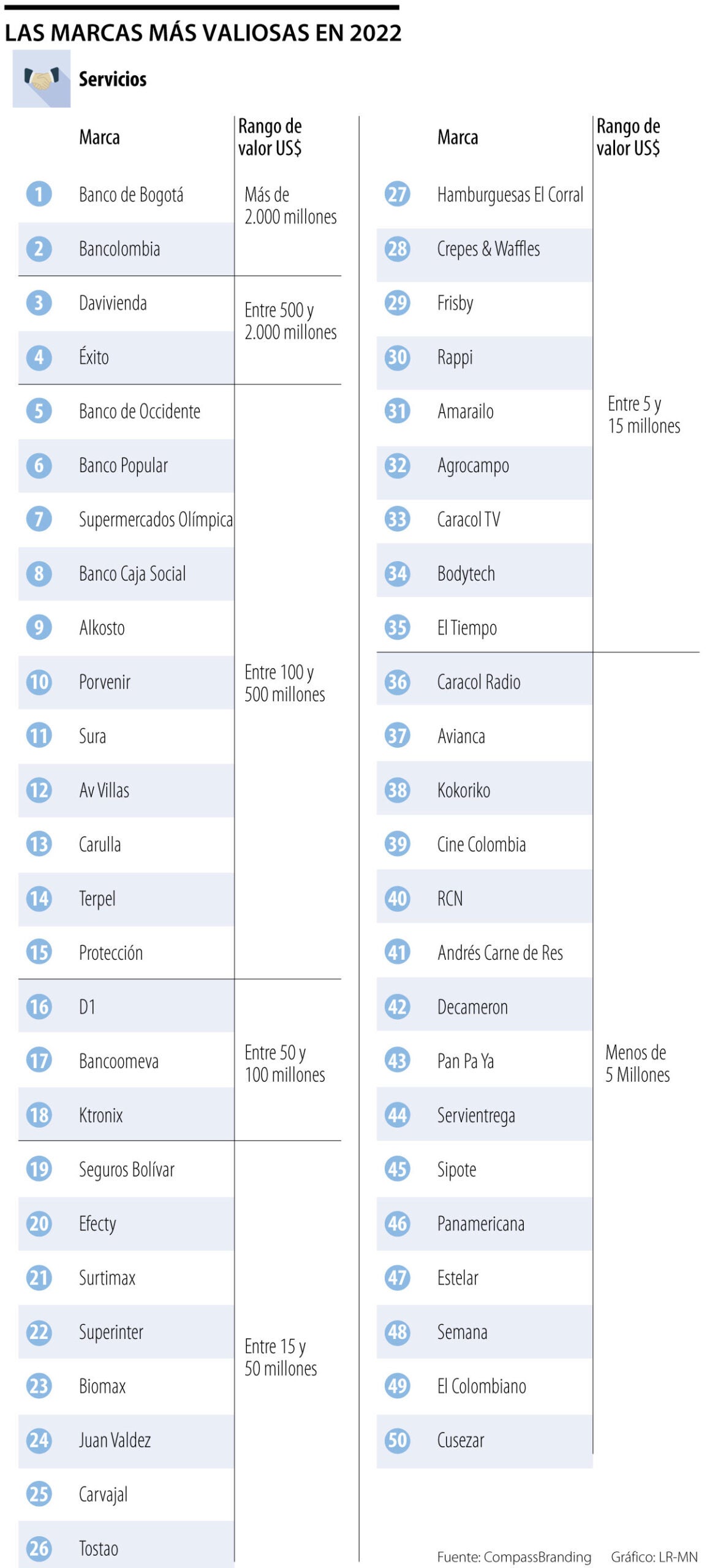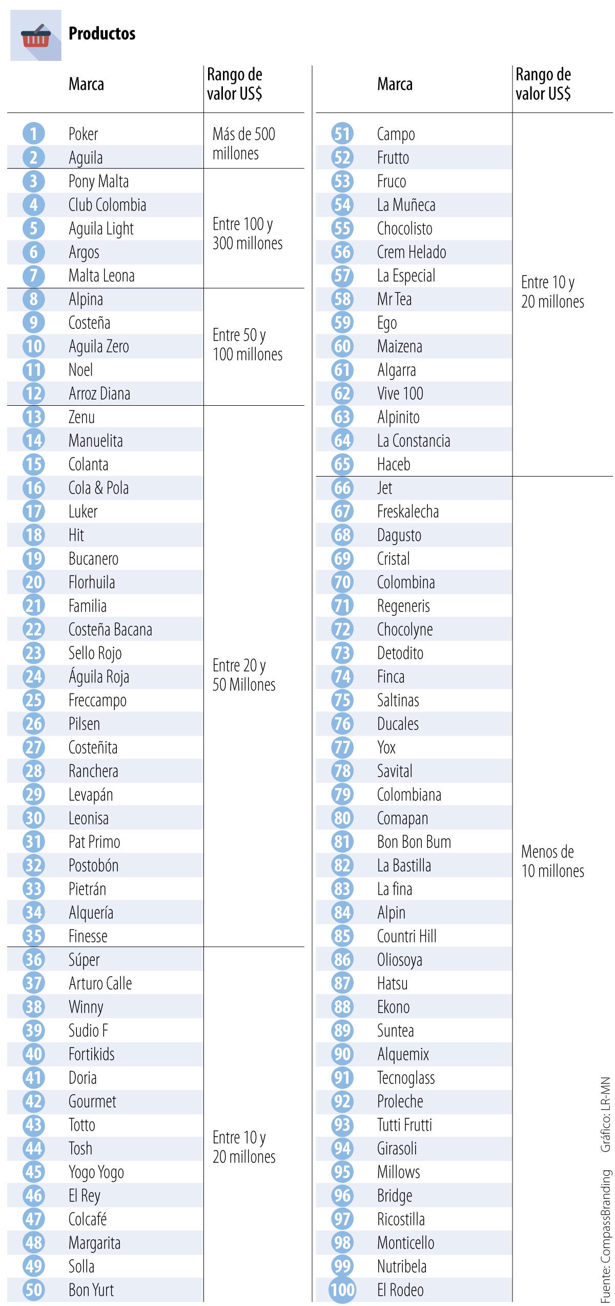El estudio de Compassbranding registra anualmente las marcas más valiosas de productos y servicios en Colombia. En el caso de marcas de productos, el listado contiene 100 marcas, y en la categoría de servicios, el listado es de 50 marcas.
