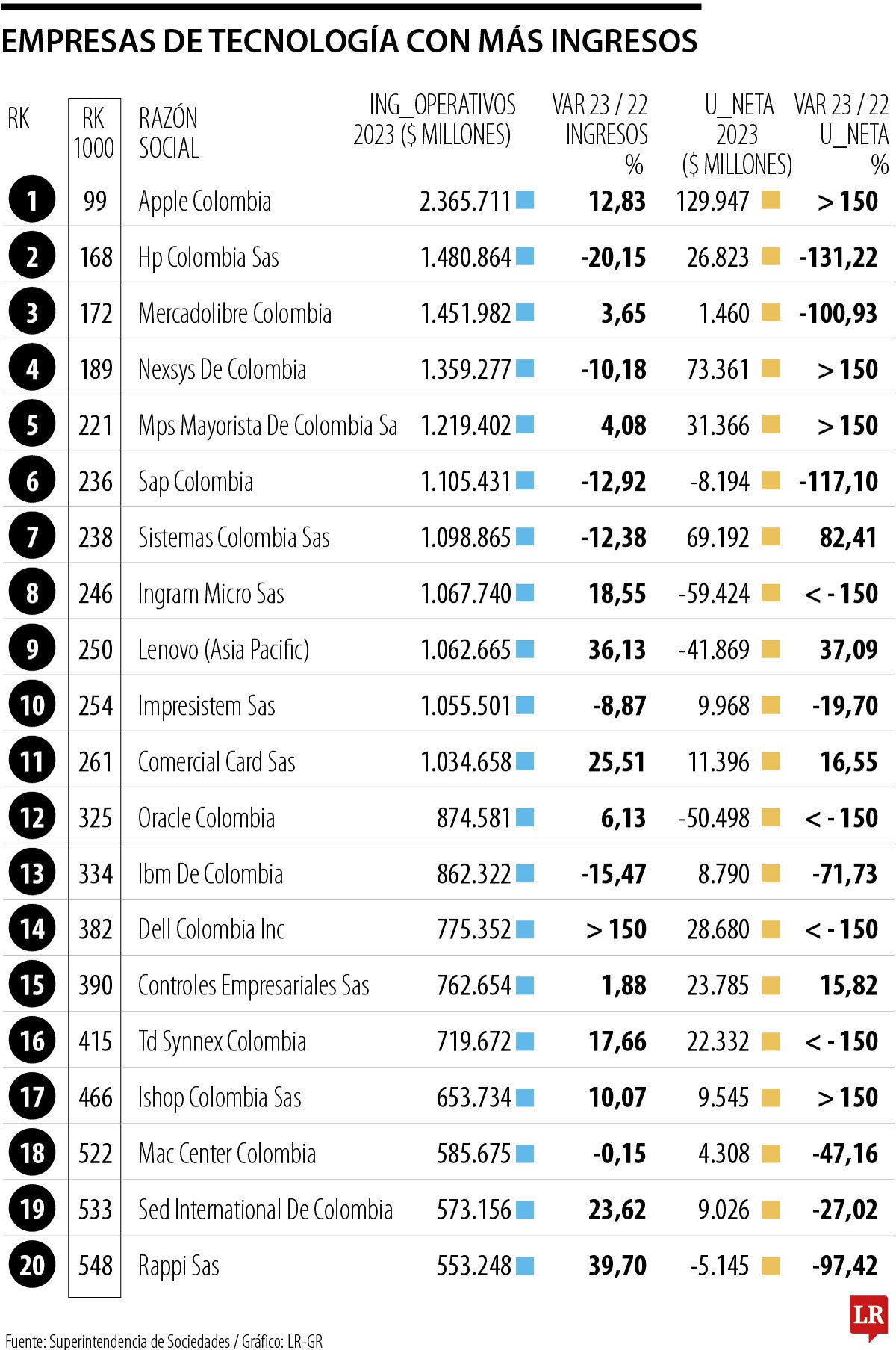 La empresa más importante fue Apple Colombia, la cual logró ingresos operativos durante el año pasado por $2,3 billones. Esta cifra representó una variación de 12,8%, mientras que su utilidad neta llegó a $129.946 millones. También está en el ranking 99 de Las Mil Empresas Más Grandes. HP Colombia ocupó el segundo lugar (podio 168 en el total de las organizaciones) al alcanzar ingresos por $1,48 billones, aunque esta cifra representó una caída de 12,3%, comparado con el año inmediatamente anterior.