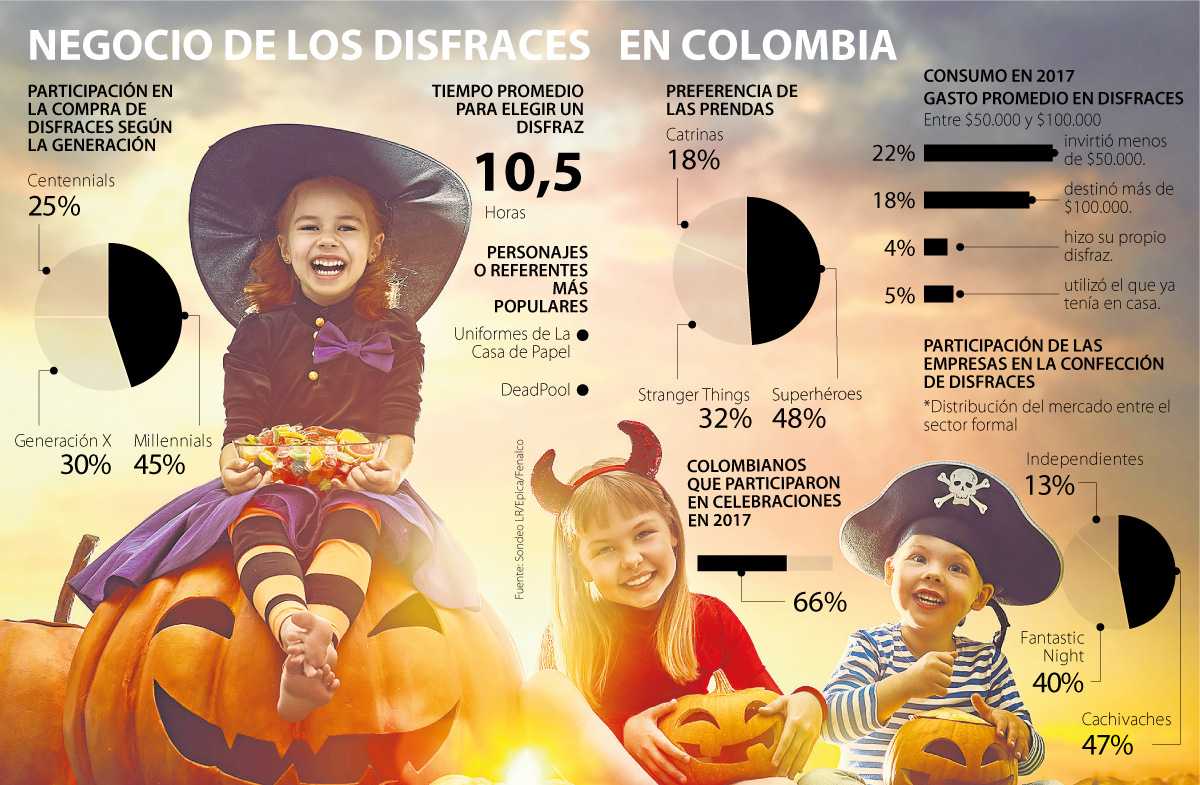Por ejemplo, la consultora prevé que además de que los colombianos gastan más de 10,5 horas para buscar su disfraz; este año, 48% de las personas que saldrán con un atuendo será de superhéroes; el segundo orden de interés se concentrará en personajes de la serie Stranger Things, con 32%; y catrinas, en un 18%. Se estima que de los que se disfrazan, según la generación, 45% son millennials.