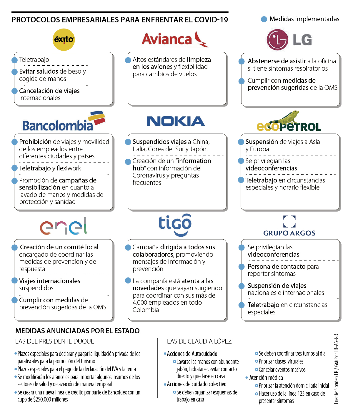 Antes de conocerse estas disposiciones, las empresas ya habían anunciado unos esquemas que van desde implementar teletrabajo, hacer videoconferencias, suspensión de eventos, cancelación de viajes, intensificar protocolos sanitarios, hasta periodos de aislamiento y evitar saludos de manos y beso. Aunque estas son las medidas comunes, hay otras que varían dependiendo del sector.