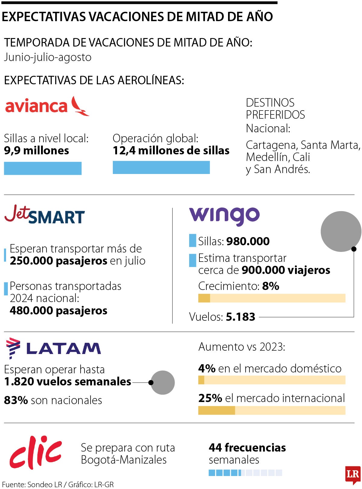 Wingo dijo que estima transportar cerca de 900.000 viajeros en su red de 35 rutas, lo que representa un crecimiento de 8%, comparado con lo operado en la temporada alta de 2023. La aerolínea pondrá a disposición de los viajeros más de 980.000 sillas a bajo costo en 5.183 vuelos. Dichas cifras representan un crecimiento de 9% en su capacidad de operación, sustentada principalmente en el crecimiento de vuelos en el mercado doméstico colombiano, así como en destinos internacionales de playa que requieren un aumento de oferta durante esta época del año.