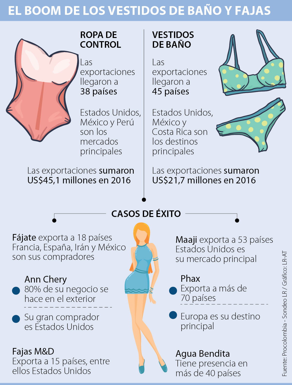 Colombia se volvió el tercer exportador más grande de fajas, y el año pasado logró facturar US$45,1 millones. Los vestidos de baño también han ganado participación y comercializaron US$21,7 millones fuera de Colombia.