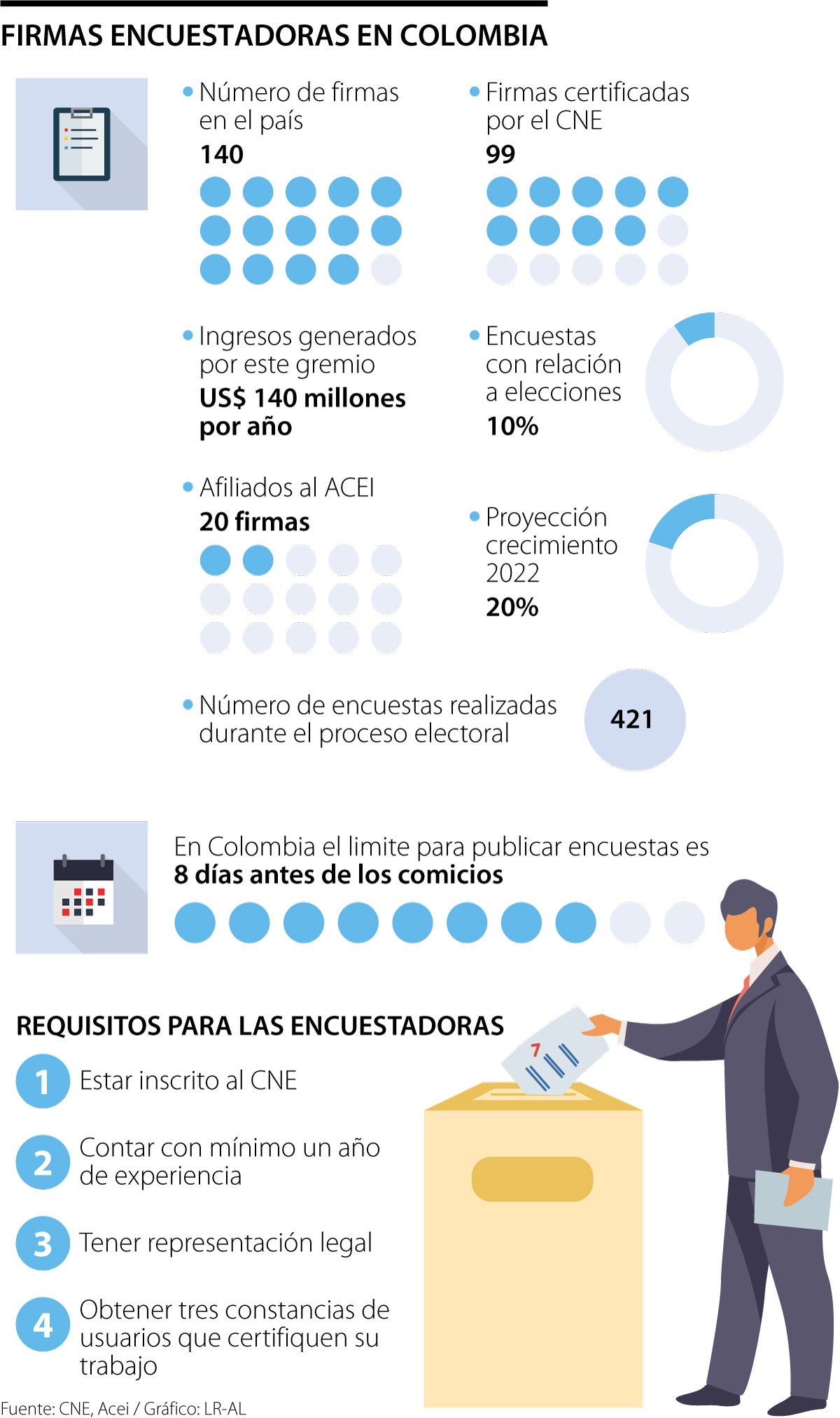 En el país funcionan 140 firmas de encuestas y estudios de mercado, y 98 registradas ante el Consejo Nacional Electoral para tomarle el pulso al país político, que están recuperando sus niveles de ventas de prepandemia y esperan crecimientos de ingresos de hasta 20% por cuenta de la encendida coyuntura electoral. Un mercado de más de US$140 millones al año según representantes del sector, y que se dinamiza con la llegada de un nuevo jugador internacional, la consultora GAD3.