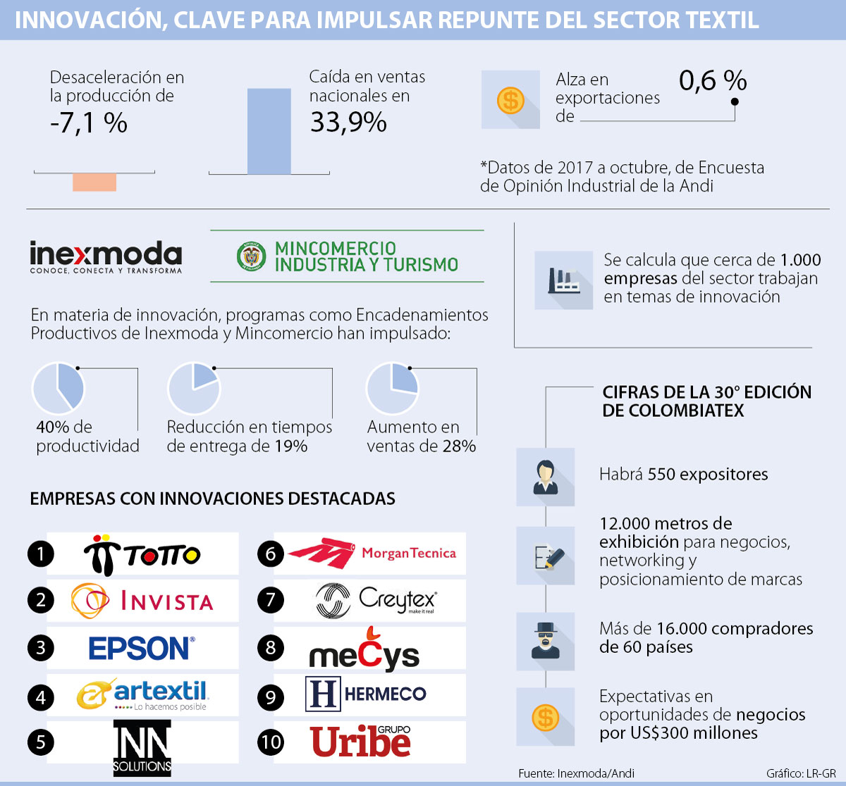 De acuerdo con datos de la Encuesta de Opinión Industrial de la Asociación Nacional de Empresarios de Colombia (Andi), el sector textil-confección presentó a octubre del año anterior una desaceleración en la producción de 7,1 %, una caída en ventas nacionales de 33,9% y una leve alza en las exportaciones de 0,6 %, con ventas acumuladas por US$ 235,6 millones.