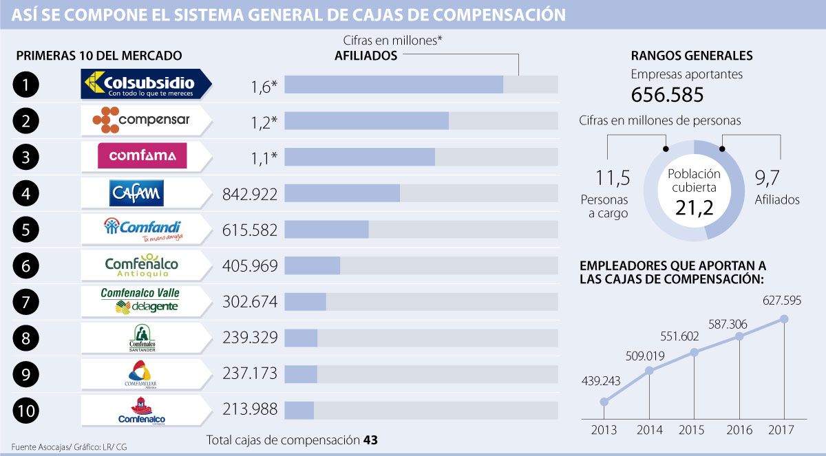 Todas trabajan bajo la misma norma de recibir un porcentaje (4%) por cada trabajador vinculado a una nómina que coloca el empleador, lo cual se destina a los planes de subsidio. En el modelo, ya hay 656.585 empresas que hacen los pagos, con lo que hay un total de 9,7 millones de afiliados. Sin embargo, el número de colombianos que se beneficia con el sistema cubre a más familias que de línea directa son 11,5 millones más, es decir, que las cajas llegan a 21,2 millones de ciudadanos.