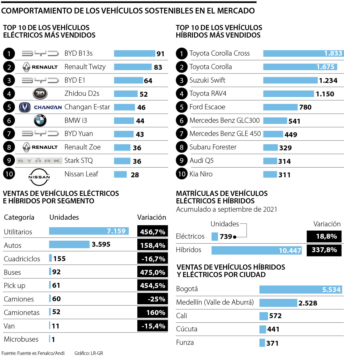 Por el lado del tipo de vehículo que más se vende en esta categoría de sostenibles, el nicho de modelos tipo utilitarios es lo que más se comercializa, con 7.159 unidades a septiembre; mientras que lo que más creció fue el segmento de buses, que aunque registra una venta de 92 unidades en los primeros nueve meses del año, es un aumento de 475%.