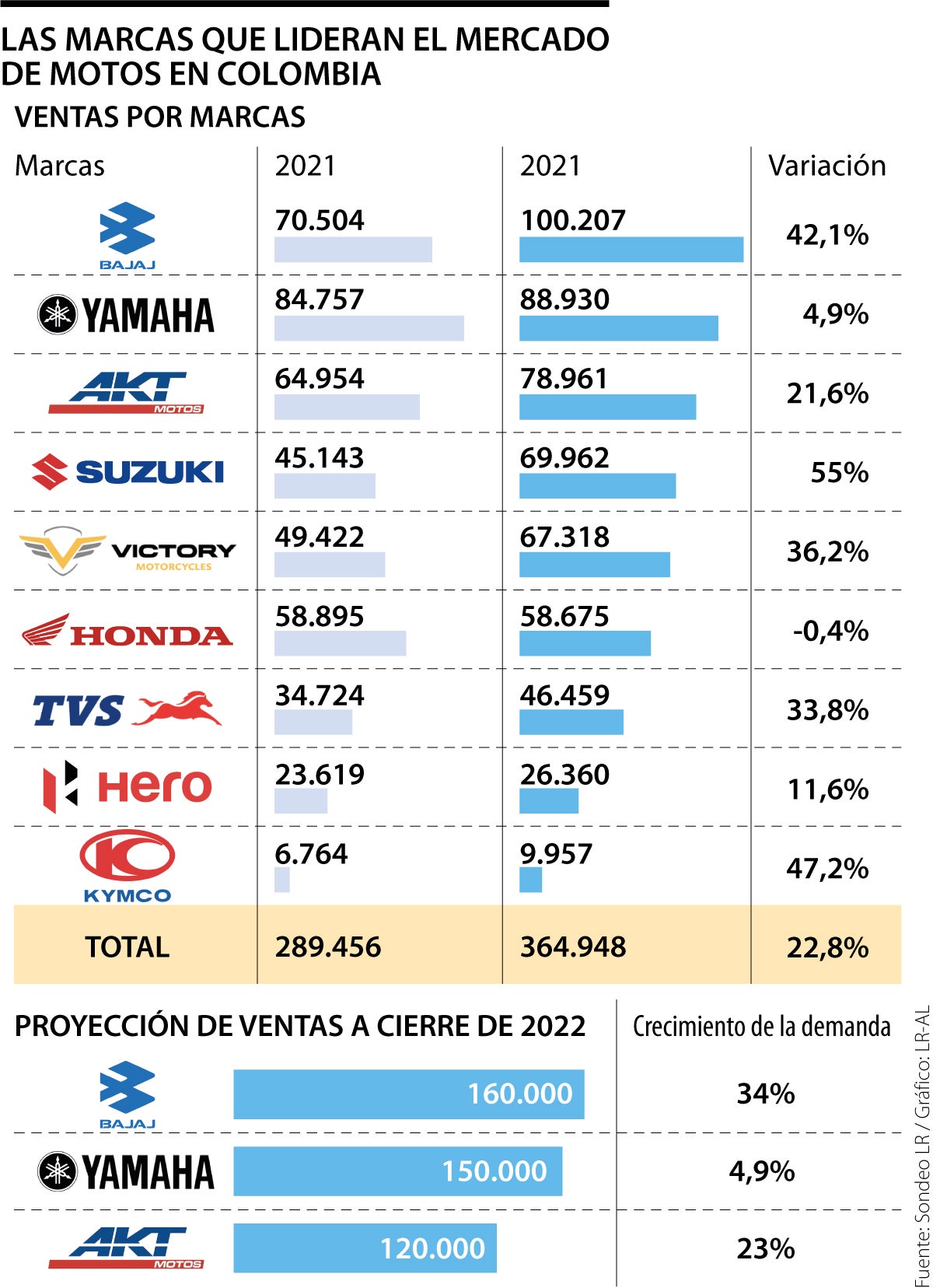 Desagregando los datos, Bajaj es la que más vende motos en Colombia, con un total de 100.207 unidades vendidas hasta agosto, que es 42,1% más que 2021. A modo estimativo, Bajaj indicó que vende más o menos 104.000 motos por mes.