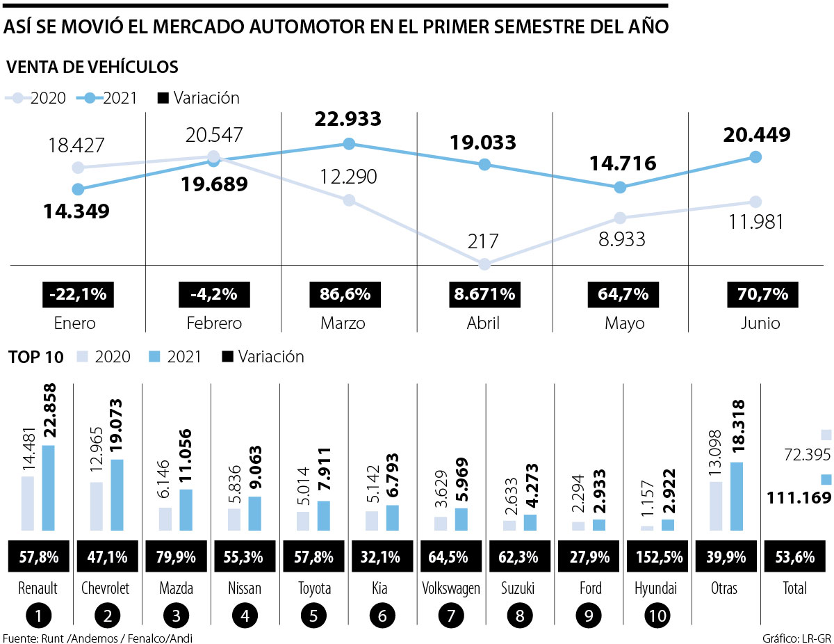 Durante junio, el mercado de vehículos logró un registro total de 20.449 matrículas nuevas, equivalente a un incremento importante en comparación con el mismo mes de 2020, cuando solo se registraron 11.981 unidades, según los datos del Runt.