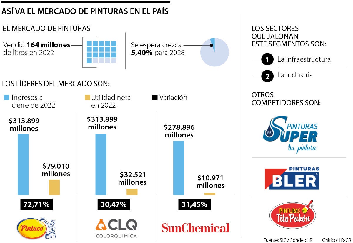 Entre las empresas que reportan mayor cantidad de ventas en el sector de las pinturas de tipo vinilo acrílico, acrílico y acrílico estireno, se encuentran Pintuco, Colorquímica y Sun Chemical, según el reporte de 1.000 empresas de Supersociedades. Otras empresas como Pinturas Super, Pinturasbler y Pinturas Tito Pabón también son competidores en el mercado colombiano.