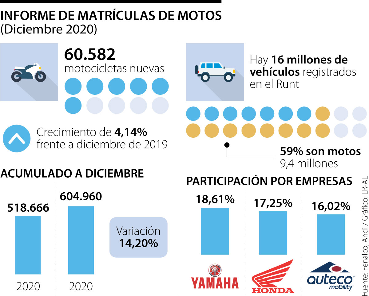 De acuerdo con la información de matrículas suministrada por el Registro Único Nacional de Tránsito (Runt), en diciembre de 2020 se matricularon 60.582 motocicletas nuevas, con un crecimiento de 4,14% respecto a diciembre de 2019.