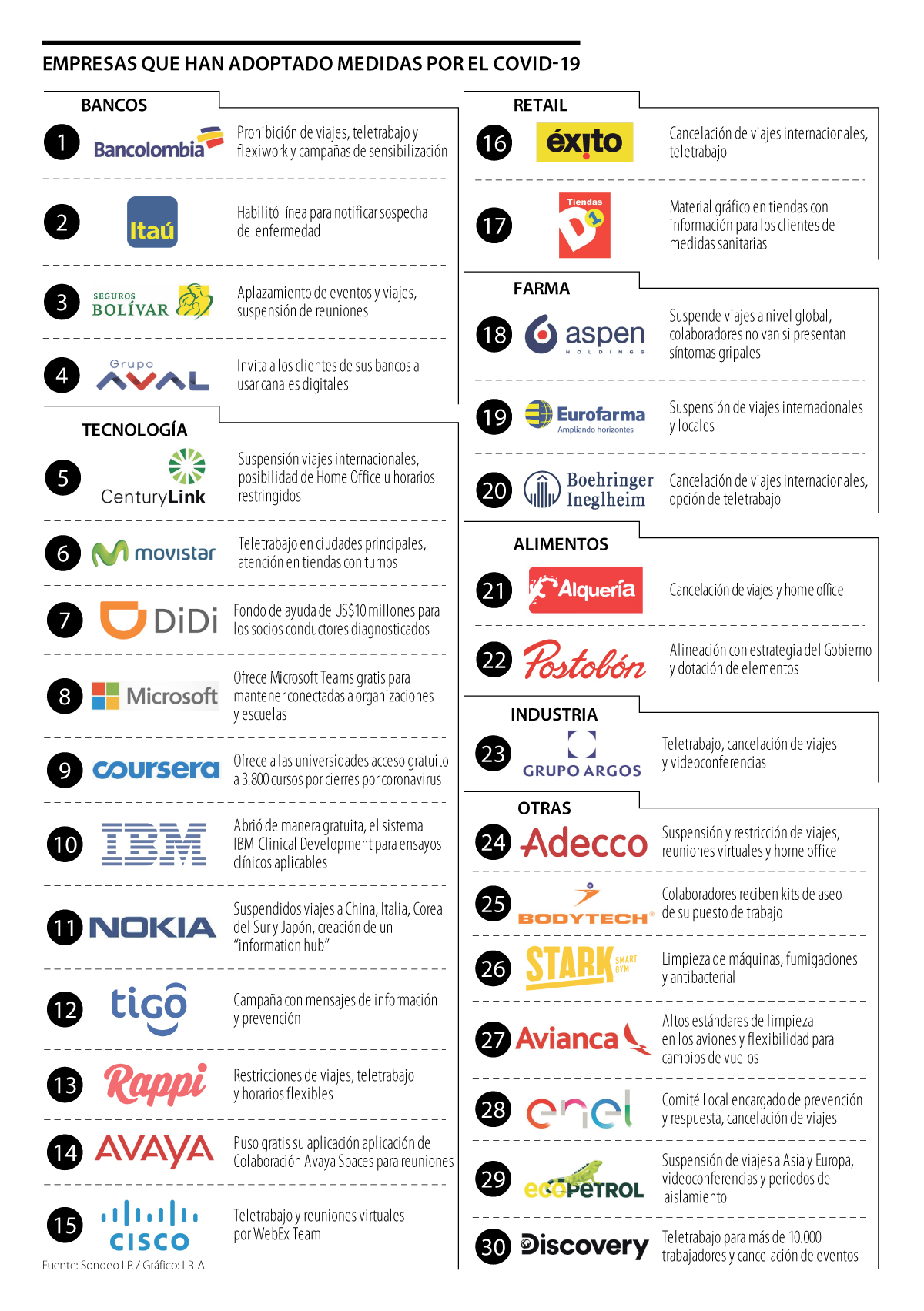 Otras compañías como Postobón, por ejemplo, han anunciado la adopción de las estrategias del Gobierno, así como la dotación de los elementos necesarios para prevenir un potencial contagio entre sus empleados, mientras que aerolíneas como Avianca no solo han flexibilizado su política de cambios en itinerarios de viaje y fechas, sino que también nuevos estándares de limpieza de máquinas, fumigaciones y antibacterial en sus aeronaves.
