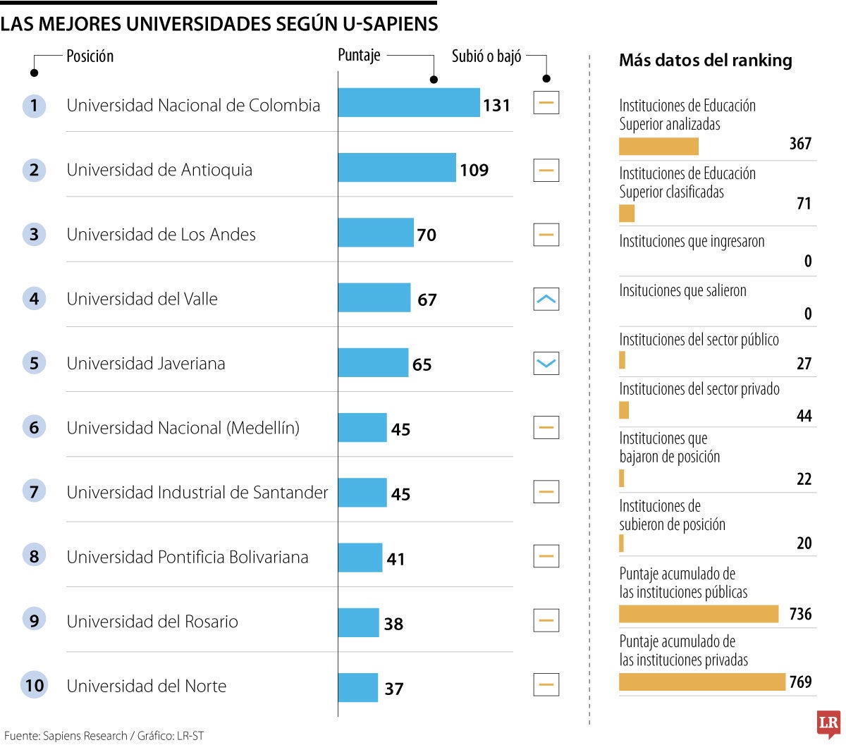 Bogotá es la región con mayor participación, puesto que aloja a cuatro de las instituciones mejor posicionadas en lo más alto del ranking. Le siguen Medellín con tres; y Cali, Bucaramanga y Barranquilla con una. En la clasificación general entraron 27 instituciones públicas y 44 privadas, con puntajes acumulados de 736 y 769, respectivamente.