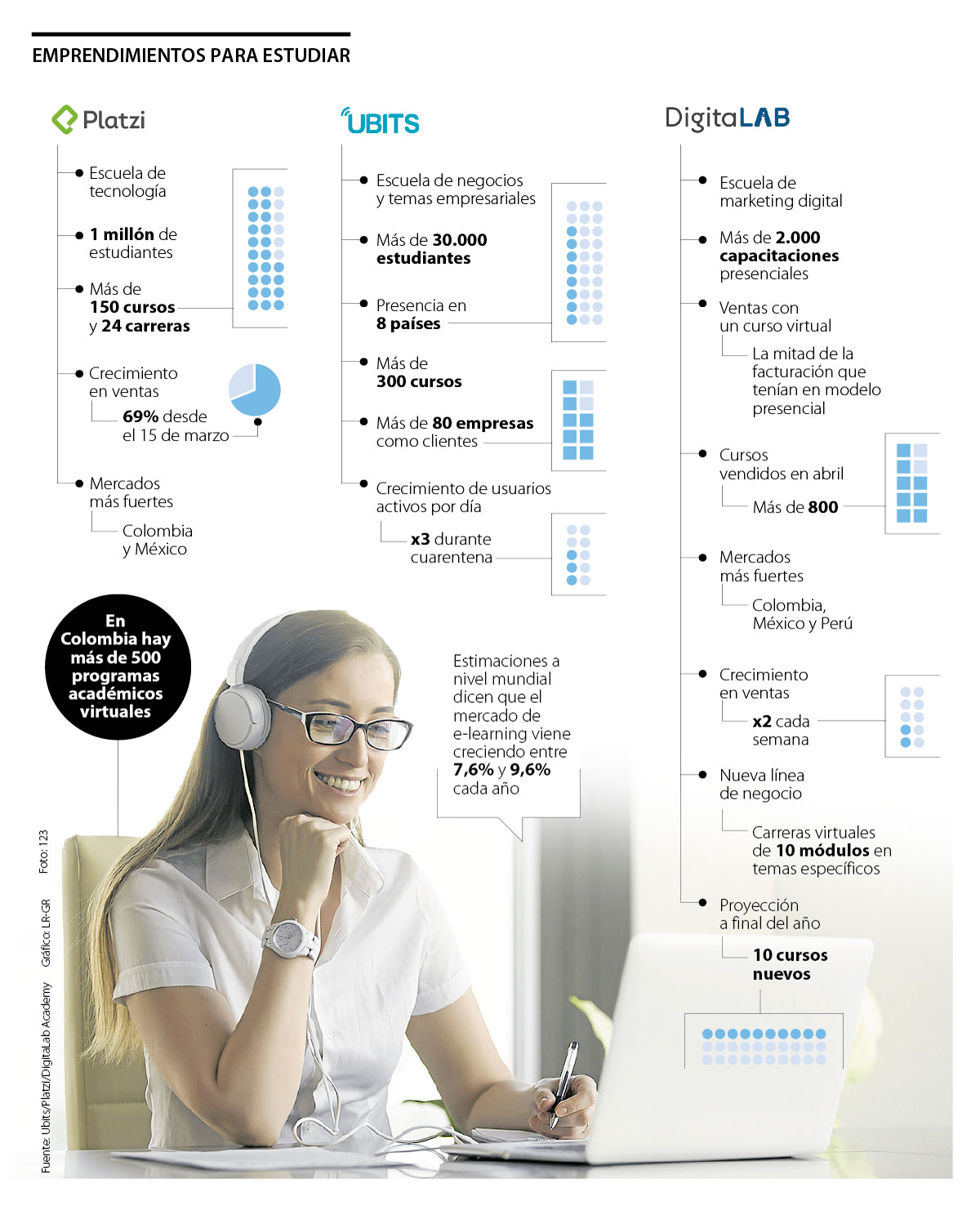 Las cifras de crecimiento de estas compañías confirman que cada vez más personas ven en la educación virtual una buena alternativa. En el último mes, Platzi ha registrado un crecimiento de 69% en sus ventas, Ubits ha multiplicado por tres el número de usuarios activos y DigitaLab Academy ha duplicado sus ventas cada semana.