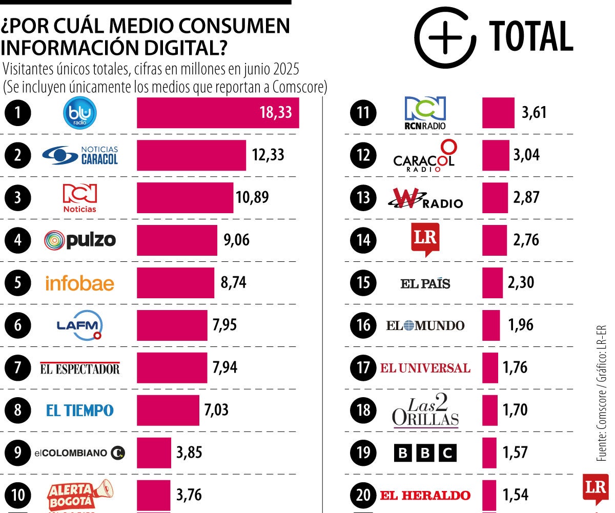 Durante junio de 2025, según los datos de Comscore (de los medios que reportan), 29,6 millones de personas consumieron la información ofrecida por estos generadores de información. Esa cifra indica que casi 57% de la población colombiana leyó, observó y escuchó sus contenidos disponibles en la web.