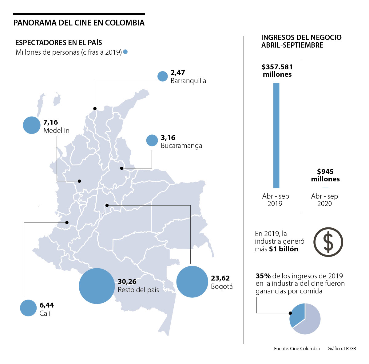 Antes de la Resolución 1746 del Ministerio de Salud, las empresas de la industria de exhibición de cine, no veían rentable la apertura de los teatros porque la venta de comida es una parte importante de sus ganancias. Gustavo Palacio, presidente de la Asociación Colombiana de Cine (Acocine), afirmó “la industria genera más de $1 billón anual, el año pasado $652 mil millones fueron de boletería, el resto corresponde a las ganancias por comida”. De acuerdo con la afirmación de Palacio, el segmento de palomitas y dulces pesa 35% de la industria.