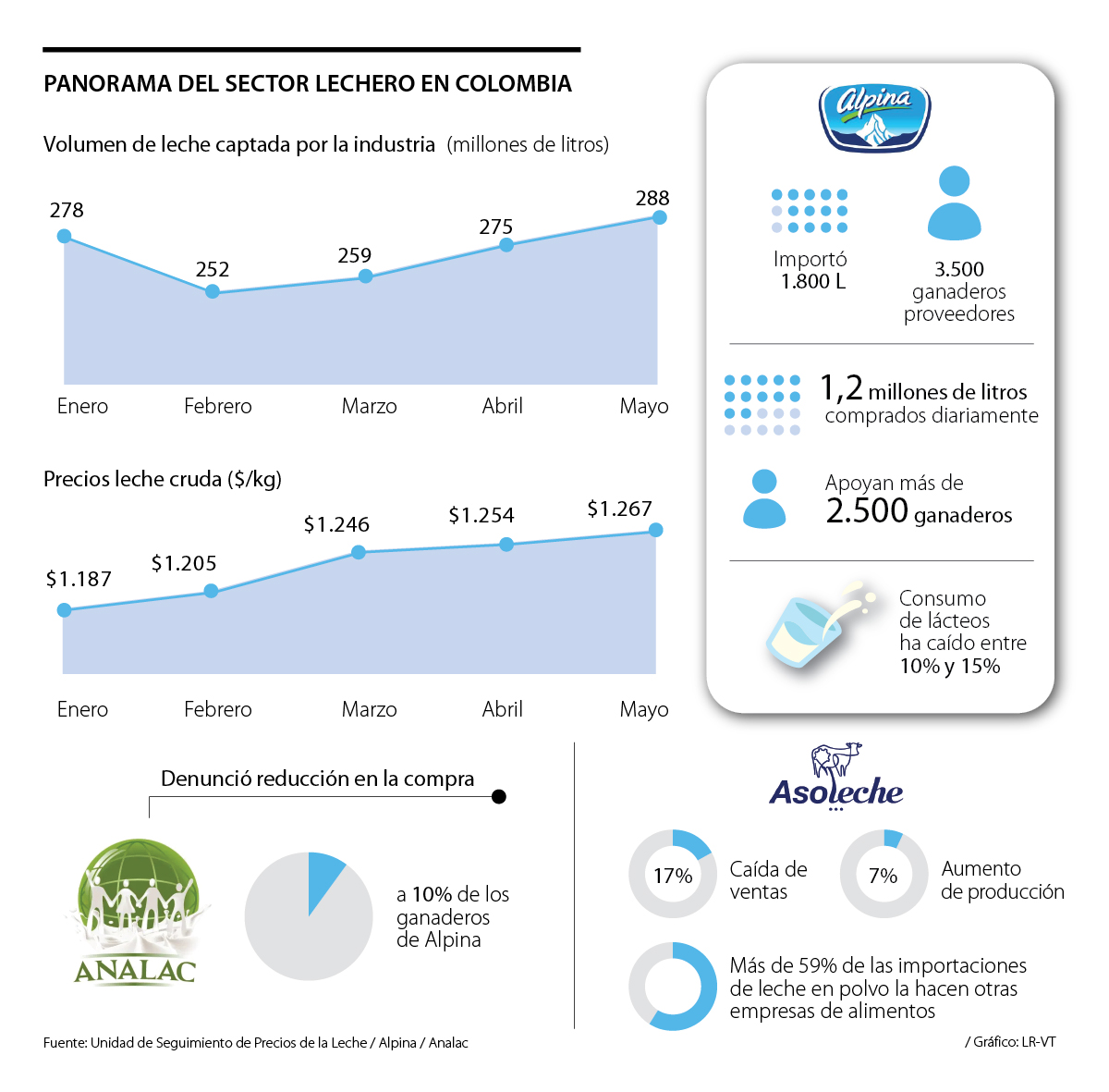 El sector lechero se sacudió este fin de semana, luego de que se conoció que la Asociación Nacional de Productores de Leche (Analac) denunció que Alpina planeaba reducir el precio de compra a sus productores y disminuir 10% el volumen total de leche que adquiere localmente, a lo que la empresa respondió aclarando que dicha decisión se debía a que las medidas que han tomado para manejar los excedentes no han sido suficientes para mitigar la caída en el consumo que ha visto el sector este año y que ha afectado a las empresas.