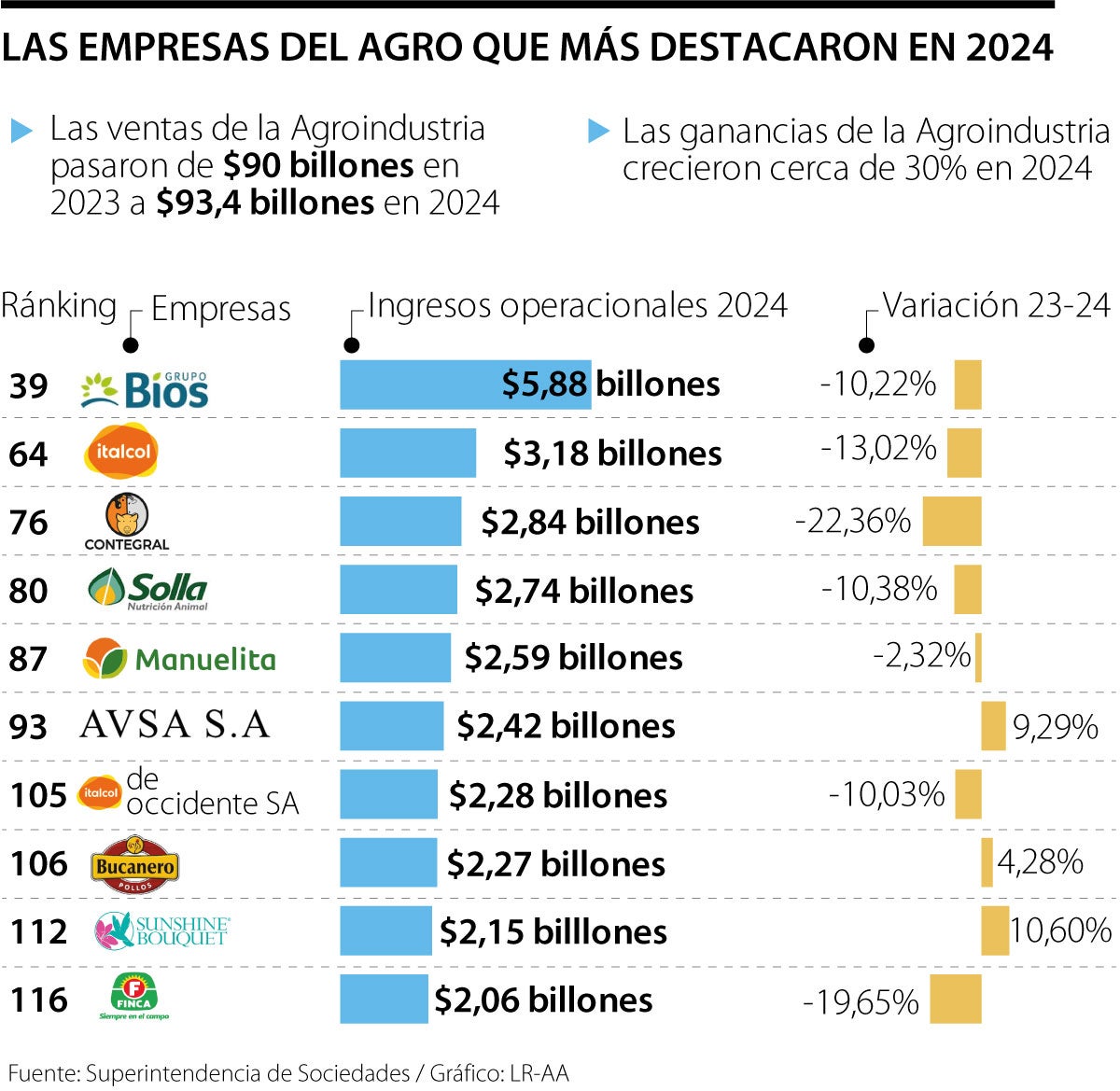 En algunos casos, las que más facturan no son las que más generan utilidades. Dentro de las con mayores ganancias en 2024 siguió liderando Grupo Bios, con $444.286 millones. La segunda es Avsa S.A., que ocupa el puesto sexto entre las 10 más vendedoras, pero con ganancias por $214.919 millones; Avidesa de Occidente con $156.340 millones; Inversiones Manuelita S.A., con $154.722 millones; cerrando con Ingenio Providencia, $153.144 millones.