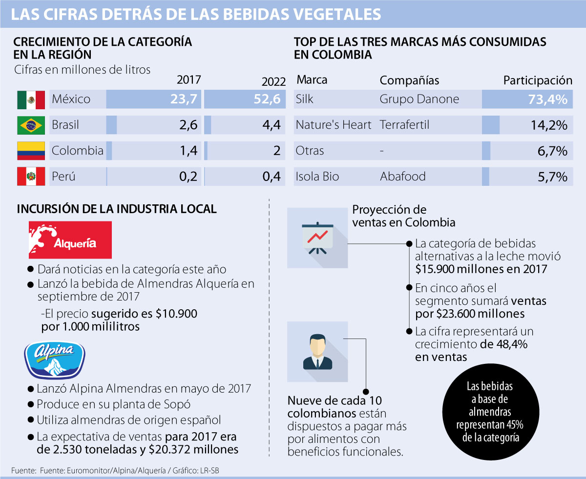 Al cierre de 2017 ese negocio movió $15.900 millones en la comercialización de 1,4 millones de litros según la firma investigadora Euromonitor. La cifra parecería baja si se compara con los $4 billones que se vendieron en leche líquida en 2016; sin embargo, resulta significativa si se tiene en cuenta que la industria local apenas incursionó en ella y que para 2022, ese número podría aumentar en 48%.