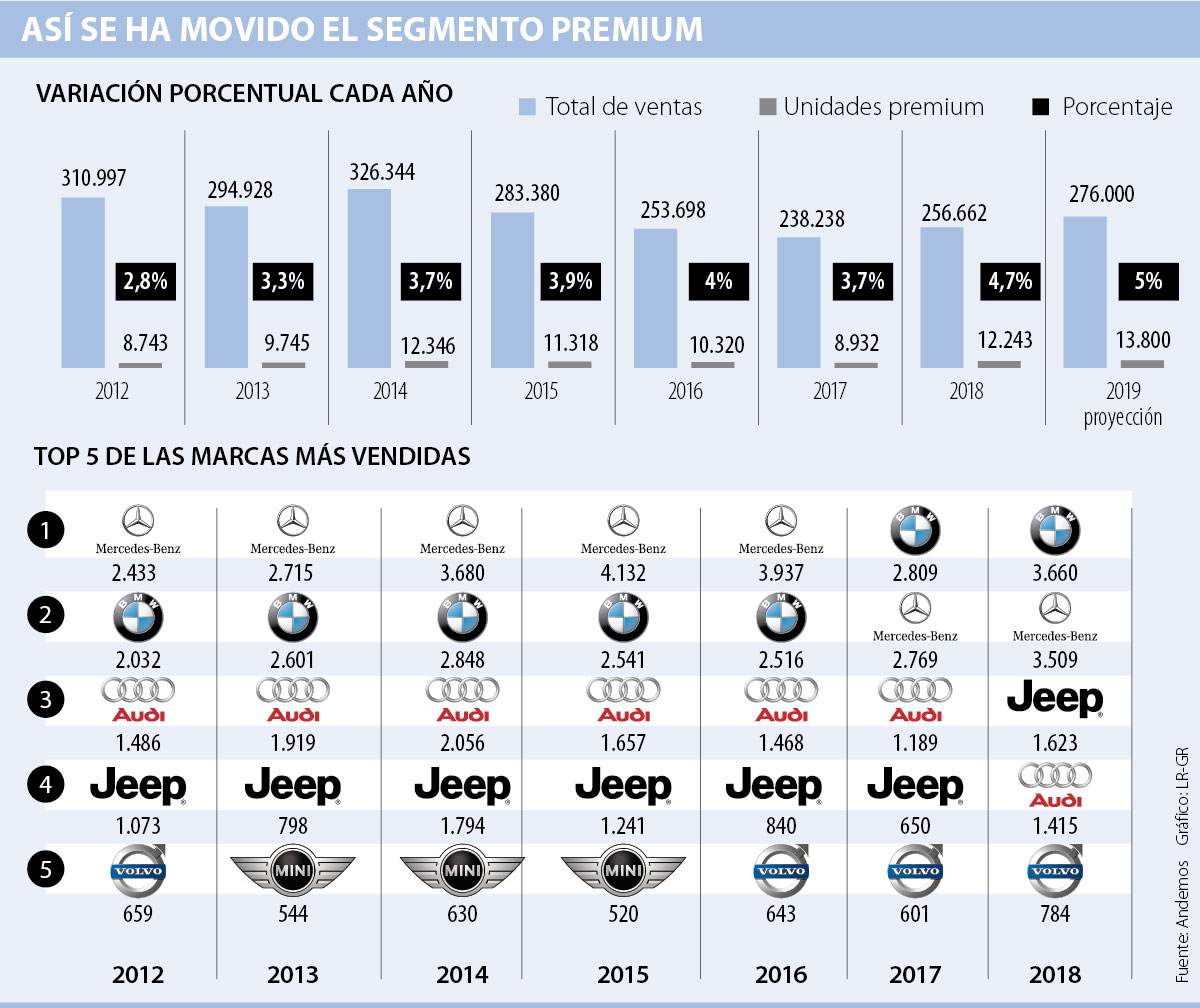 Uno de los que tendrá mayor crecimiento es el premium, que según cálculos de Andemos, durante 2019 representará 5% de las ventas totales del país, con 13,800 unidades de las 276.000 proyectadas para el año. Además, la cifra del segmento muestra un crecimiento de 12,7%, respecto a 2018; varios puntos por encima del 7,5% que se proyecta crecerá el total de ventas de vehículos nuevos.